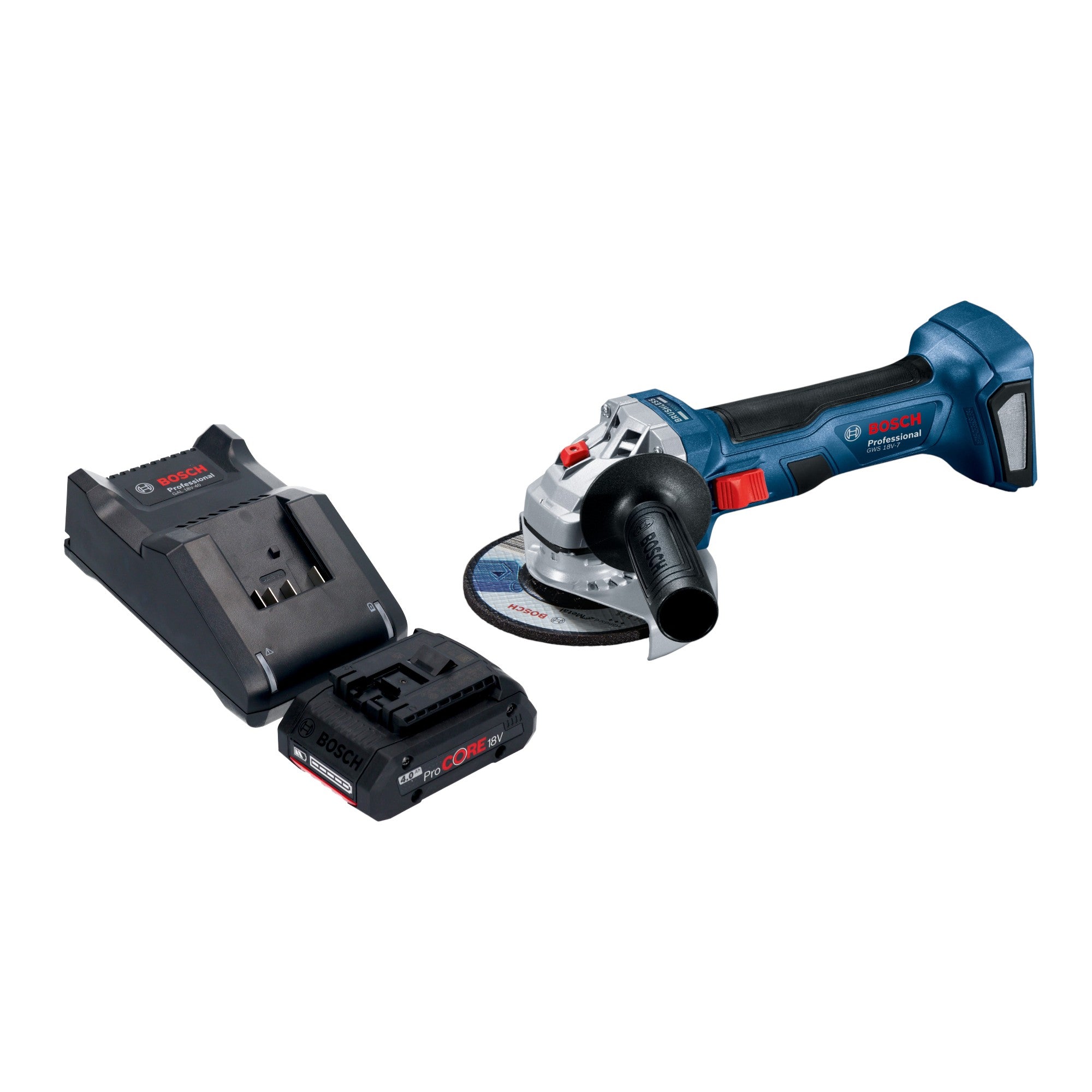 Bosch GWS 18V-7 Professional Akku Winkelschleifer 18 V 115 mm Brushless + 1x ProCORE Akku 4,0 Ah + Ladegerät