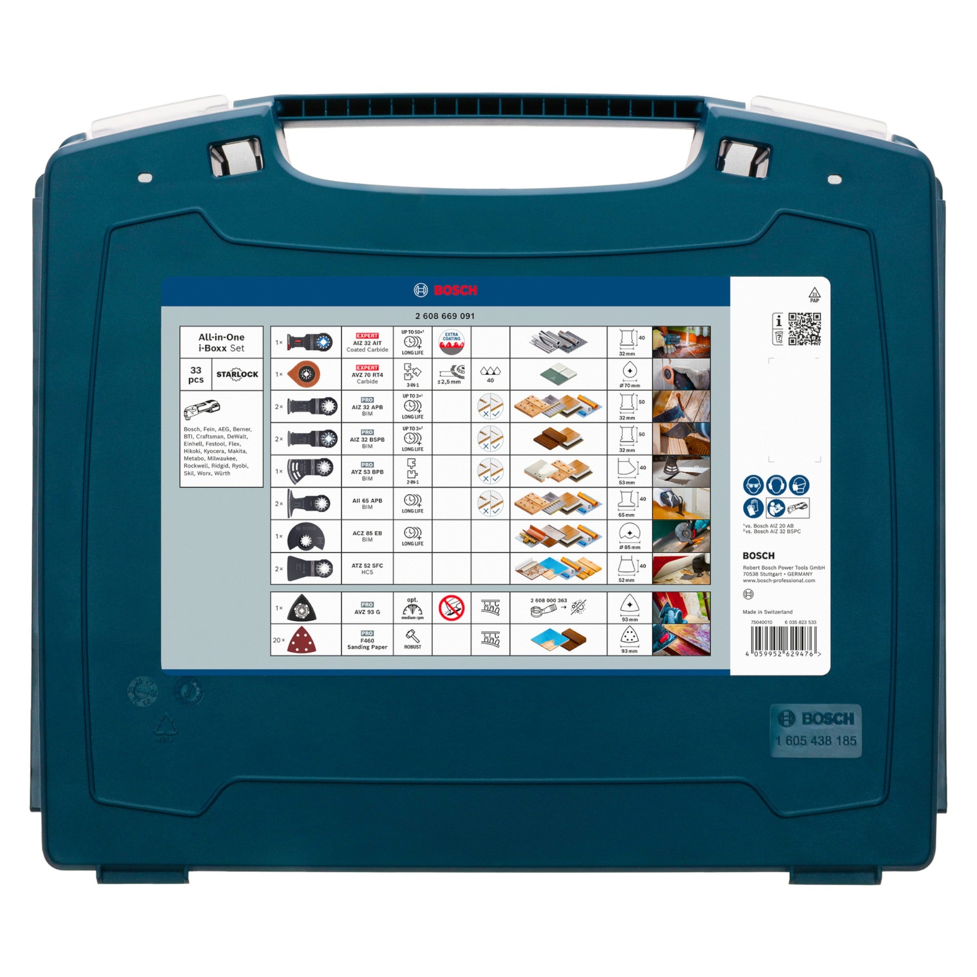 Das Bosch Professional All-in-One i-BOXX Blatt-Set (33-tlg.) ist ein besonders vielseitiges Zubehörset für oszillierende Multifunktionswerkzeuge und deckt ein breites Anwendungsspektrum von Schneiden über Schleifen bis hin zu Schabearbeiten ab. Für anspruchsvolle Metallarbeiten ist ein EXPERT AIZ 32 AIT MetalMax Tauchsägeblatt (32 mm) enthalten, das sich für präzise Tauchschnitte in harten Metallen sowie für bündige Schnitte eignet. Ergänzt wird es durch das EXPERT AVZ 70 RT4 Carbide-RIFF Fugen- und Mörtelentfernerblatt (70 mm), das ideal zum Entfernen von Fugenmörtel, Fliesenkleber und Mörtel bei Sanierungs- und Fliesenarbeiten ist. Für Holz- und Multimaterialanwendungen stehen mehrere Tauchsägeblätter zur Verfügung: Zwei AIZ 32 APB (32 mm) für Tauchschnitte in Holz und Metall sowie zwei AIZ 32 BSPB (32 mm), die speziell für kraftvolle Schnitte in Hartholz ausgelegt sind. Das PRO AYZ 53 BPB Dual-Tec Sägeblatt (53 mm) ermöglicht präzise Tauch- und gerade Schnitte, auch in engen Ecken oder bei Platten- und Sandwichmaterialien. Zusätzlich sorgen zwei AII 65 APB Tauchsägeblätter (65 mm) für breite, effiziente Schnitte in Holz und Metall. Für bündige Schnitte entlang von Kanten, etwa in Laminat, Holzparkett oder Aluminium-Deckleisten, ist ein ACZ 85 EB Segment-/Halbkreis-Sägeblatt (85 mm) enthalten. Auch für Oberflächenbearbeitung und Nacharbeiten ist das Set umfassend ausgestattet: Zwei ATZ 52 SFC Schaber (52 mm) eignen sich zum Abschaben und Entfernen von Kleber-, Farb- oder Materialresten. Zum Schleifen liegt eine AVZ 93 G Schleifplatte (93 mm) bei, ergänzt durch 20 F460 Schleifblätter, die eine effektive Oberflächenbearbeitung ermöglichen. Sämtliches Zubehör ist übersichtlich und sicher in einem robusten i-BOXX Kunststoffkoffer mit transparentem Deckel untergebracht, der L-BOXX-kompatibel ist und sich ideal für Transport und Ordnung auf der Baustelle eignet. Die Starlock-Aufnahme sorgt für optimale Kraftübertragung und ermöglicht einen bequemen Blattwechsel innerhalb von 3 Sekunden.
