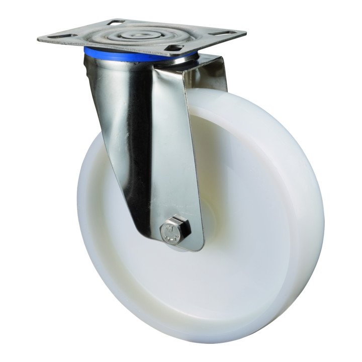 Transportgeräterolle mit Edelstahlgehäuse · zweireihiger Kugelkranz im Gabelkopf · Rad Polyamid (weiß) · Gleitlager · Radachse verschraubt · mit Plattenbefestigung · Rostfrei