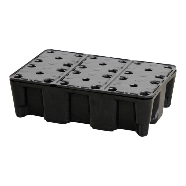 für Kleingebinde · zur sicheren und vorschriftsmäßigen Lagerung gewässergefährdenden Flüssigkeiten der GHS-Kategorien 1-4 · aus HD-Polyethylen · sehr beständig gegen Laugen, Öle und Säuren · stapelbar · rutschsichere Plattenoberfläche · konzipiert für Kombination auf Europalette · mit DIBT-Zulassung Nr. Z-40.22-548 und Z-40.22-549 Lochplatten-Rost mit besonderen Stützkegeln, dadurch hohe Tragfähigkeit bei gleichmäßig verteilter Last