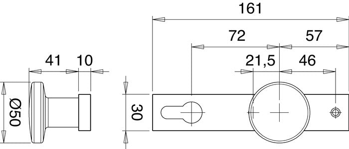 Schlosskastenkurzschild mit geradem Knopf · Entfernung 72 mm · PZ-gelocht · massives Schild · passend für alle Schlosskästen mit 8 mm Nuss · Knopf mit M-12 Gewinde · Schraublochabstand 67 mm · Stärke 10 mm · Höhe 161 mm · Breite 30 mm · sichtbare Verschraubung · DIN links / rechts · Aluminium · Lieferung ohne Stift und Schrauben
