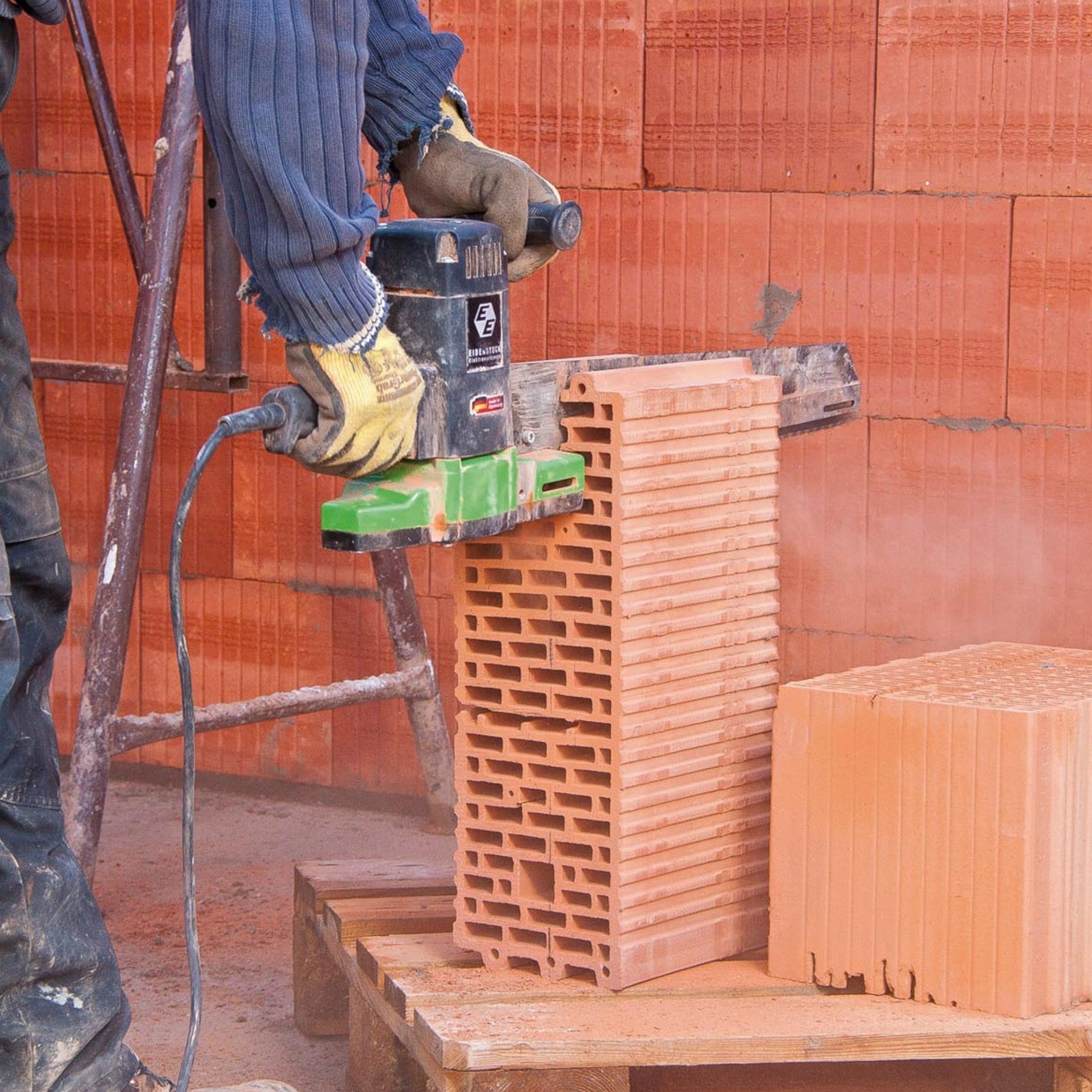Die Eibenstock EDB 480.1 Doppelblattsäge ist ein leistungsstarkes und flexibles Werkzeug, das speziell für das Schneiden von Hochlochziegeln, Porenbeton, Holz sowie druckfesten Dämmstoffen entwickelt wurde. Im Vergleich zu schwer transportierbaren Ziegelsägen ermöglicht diese Säge eine schnellere und kostensparendere Trennung von Hochlochziegeln, wodurch sie sich besonders für den Einsatz im Hoch- und Tiefbau, Trockenbau sowie in Zimmereien eignet. Mit dieser Säge lassen sich problemlos Ausklinkungen herstellen und Planziegel passgenau zuschneiden. Der leistungsstarke 1.800 W Motor sorgt für eine hohe Schnittgeschwindigkeit und eine lange Standzeit, was die Säge zu einem zuverlässigen Partner für zahlreiche Anwendungen macht. Die robuste, verwindungssteife Schwertkonstruktion sorgt für präzises Schneiden, während die zwei gegenläufig arbeitenden Sägeblätter ein rückschlagfreies Sägen ermöglichen, was die Sicherheit während der Arbeit erhöht. Besonders praktisch ist die Gebläse-Funktion, die sowohl das Getriebe als auch den Anwender vor Staub schützt und für eine saubere Arbeitsumgebung sorgt. Mit einer kompakten und schlanken Bauform ist die Säge besonders handlich und ermöglicht randnahes Arbeiten. Der ergonomische Handgriff kann an zwei Seiten montiert werden, was die Handhabung noch flexibler und komfortabler macht.
