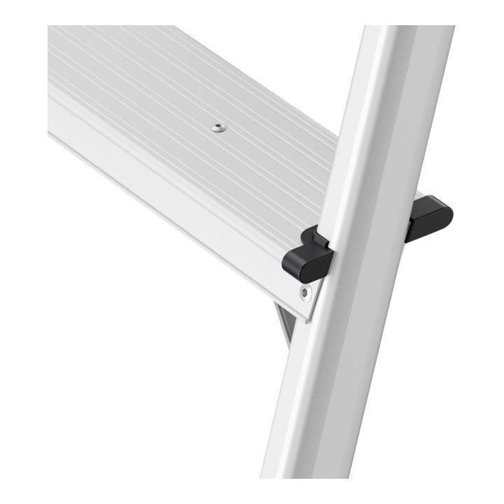 Aluminium · leicht und handlich · platzsparend, zusammenklappbar · Stufen mit Anti-Rutsch-Riffelung · Holme eloxiert · Sicherheitsverriegelung · 2-Komponenten-Kunststofffuß für sicheren Stand auf verschiedenen Böden · max. Gesamtbelastung 150 kg Für den gelegentlichen Einsatz im Büro.