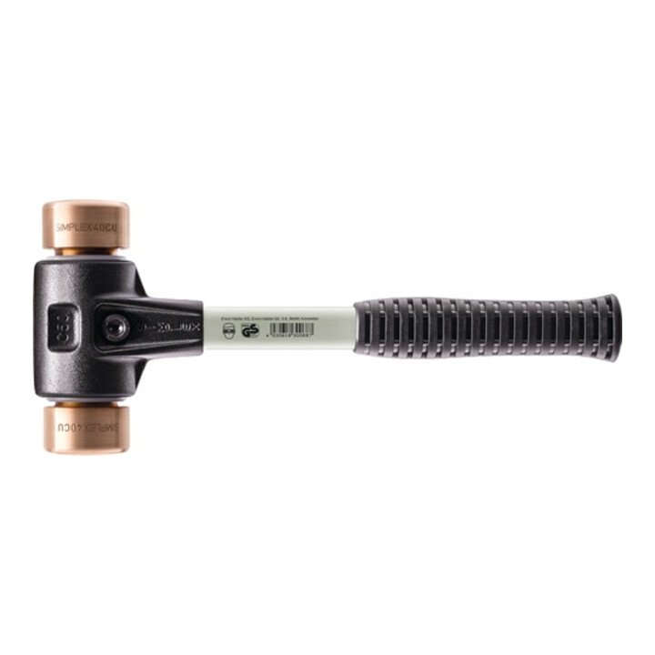 2-teiliges Spanngehäuse aus verstärktem Temperguss, schwarz · Fiberglasstiel mit rutschsicherem Gummigriff · Schlageinsätze und Simplex-Stiel sind leicht auswechselbar durch Lösen bzw. Spannen der Innensechskant-Spannschraube · Schlagköpfe, für sehr hohe Schlagkraft beidseitig aus Kupfer mit Kunststoffhülse, hart · Anwendungsbereiche: Montage-/ Reparaturarbeiten im Kfz-Bereich, Reparatur-/ Instandhaltungsarbeiten, Gießerei