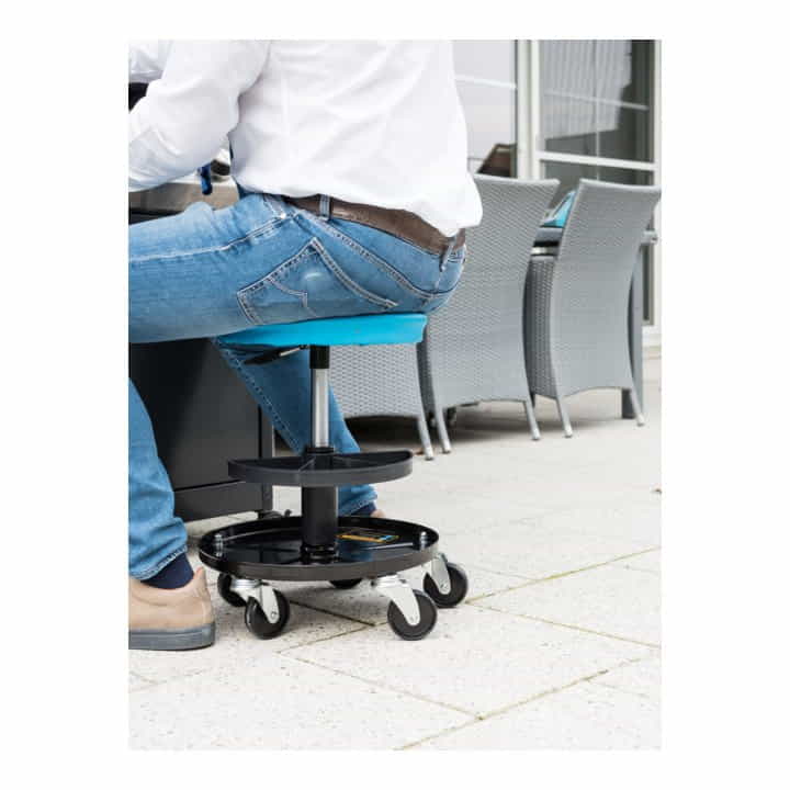 rollbarer Arbeits-Sitz, pneumatisch höhenverstellbar · 5 Rollen (ca. 76 mm Durchmesser) · mit gepolsterter Sitzfläche 320 mm Durchmesser · Tragkraft: bis 150 kg · höhenverstellbar von 396 bis 526 mm · 2 Werkzeug-Ablagen, 1 Ablage um 360° drehbar · kippsicher
