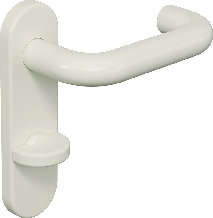 in R-Technik mit Schildern nach DIN 18255 und DIN EN 1906 aus Polyamid, Oberfläche hochglänzend, bestehend aus: Türdrücker in U-Form aus Polyamid mit durchgehendem Stahlkern bis in das Drückerende, durchgängig eingefärbt, Durchmesser 20 mm, mit Ansatzführung und Rastnut, Montage durch einfaches Einrasten der Türdrücker in die auf der Tür vormontierten Unterteile. Die Rastung kann mittels Demontageschlüssel wieder gelöst werden. Der Drücker erfüllt die Vorgaben der DIN EN 179 und DIN 18040. Schildunterkonstruktion in Kunststoff-Edelstahlverbundbau, DIN links und DIN rechts verwendbar. Festdrehbarlagerung der Drücker mit selbsttätig einrastender Rundumverriegelung und 5 mm Lagerstelle als wartungsfreies Gleitlager mit elastischem Ausgleichsbereich und zweiter Lagerstelle im Drückerhals. Verdeckte, lockerungssichere Verschraubung mit M4 Schrauben- und Hülsenschraubenkombination sowie Stützzapfen. Schild-Abdeck-Kappe aus Polyamid durchgängig eingefärbt, 46 x 180 mm, 13 mm hoch, gewölbt, 1,5 mm Wandstärke. Ausgelegt und geprüft für den Objektbereich, Gebrauchs-Kategorie nach DIN EN 1906 - Klasse 4 Garnitur mit Vierkantstift 8 mm · Drückerlänge 138 mm · Drückergarnitur · Entfernung 78 mm