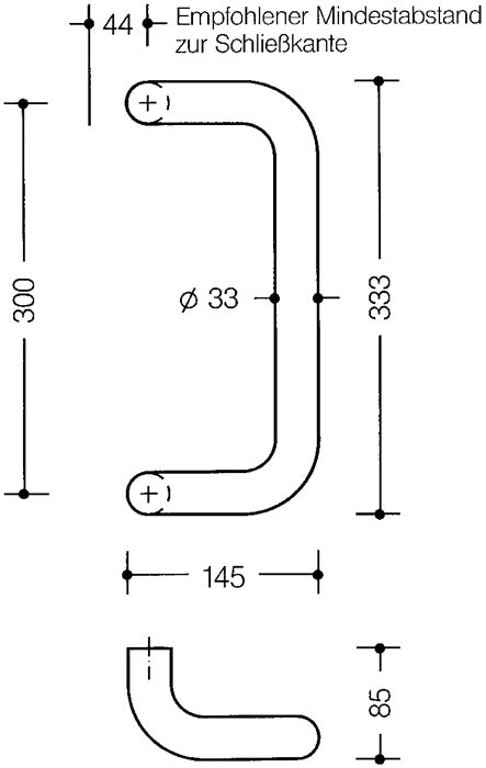 Stoßgriff System 111 · Winkelgriff in gebogener Form ausgeführt, mit gerader Anbindung · zur Montage vorgerichtet für Blatt-Türen · Achsmaß 300 mm · aus durchgefärbtem, mattem Polyamid · Durchmesser 33 mm · für einseitige und paarweise Befestigung · Ausführungsvorschlag! Bitte alle Maße und baulichen Gegebenheiten im Auftragsfall prüfen!