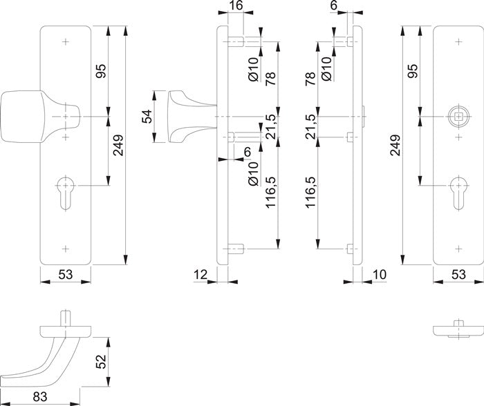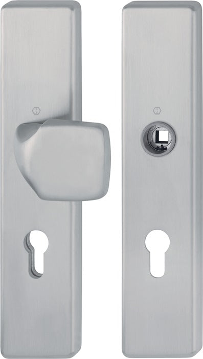 ohne Türgriff für Außen-/Wohnungsabschluss-Türen · zertifiziert nach DIN 18257 ES1, erfüllt die Anforderungen nach DIN EN 1906: 37-0142A (SK2) in Verbindung mit den passenden Türgriffen, Objekt-Garnitur · Gebrauchskategorie Klasse 3 · PZ Lagerung: außen gekröpfter Knopf fest, ummontierbar, innen für Türgriff lose, Rückholfeder rechts/links verwendbar, wartungsfreies Gleitlager Verbindung: HOPPE-FDW-Vollstift für HOPPE-Schnellstift (Lochteil) Unterkonstruktion: außen Stahl, innen Aluminium, Stütznocken Befestigung: verdeckt, durchgehend, Gewindeschrauben M6 Die Schutz-Langschild-Wechsel-Garnitur ist ausschließlich mit HOPPE-Schnellstift-Türgriff-Lochteilen kombinierbar und entspricht nur so den Anforderungen der Schutzklasse ES1 (SK2).