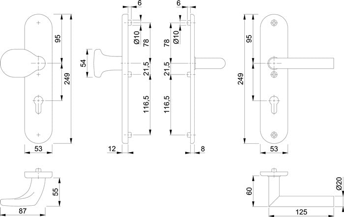 für Abschlusstüren · Zamak-Unterkonstruktion im Außen- und Innenschild · mit feststehendem Knopf · FDW-Profilstift-Verbindung · sichtbare Verschraubung · PZ · einschließlich Befestigungsmaterial M6 · Außenschild-Randhöhe 12 mm · Entfernung 72 mm · Vierkant 8 mm · DIN links / rechts · Widerstandsklasse ES 0