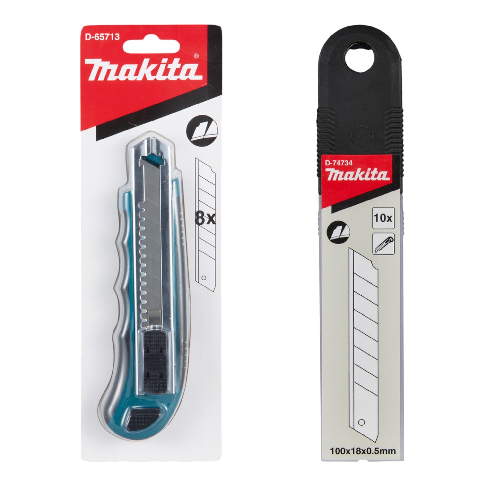 Makita Abbrechklingenmesser Cuttermesser 100 mm + 8x Ersatzklingen ( D-65713 ) + 10 tlg. Abbrechklingen Satz ( D-74734 )