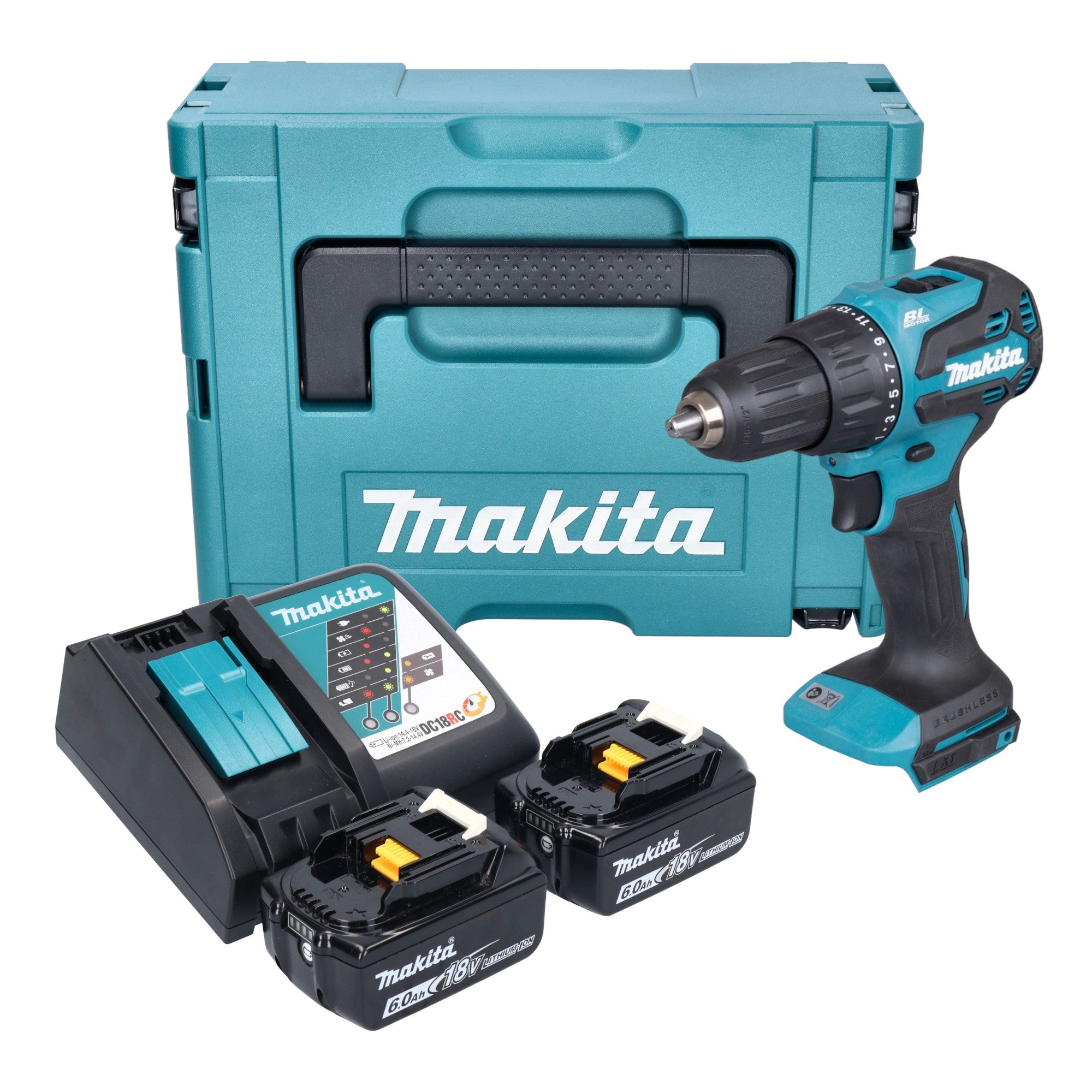 Makita DHP 490 RGJ Akku Schlagbohrschrauber 18 V 65 Nm Brushless + 2x Akku 6,0 Ah + Ladegerät + Makpac