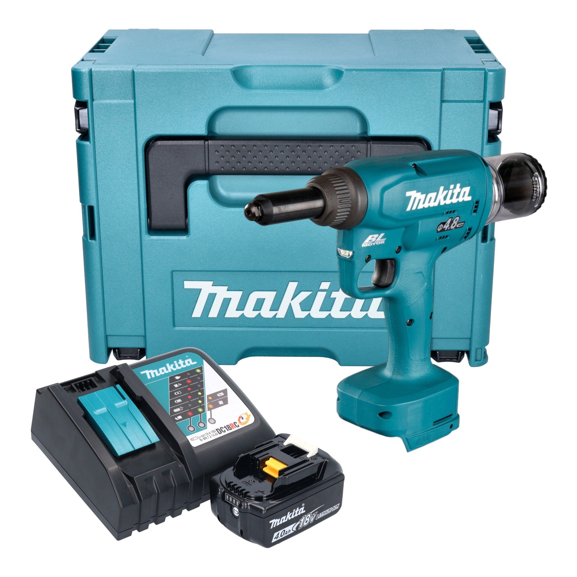 Makita DRV 150 RM1J Akku Blindnietsetzgerät 18 V 10 kN 2,4 - 4,8 mm Brushless + 1x Akku 4,0 Ah + Ladegerät + Makpac