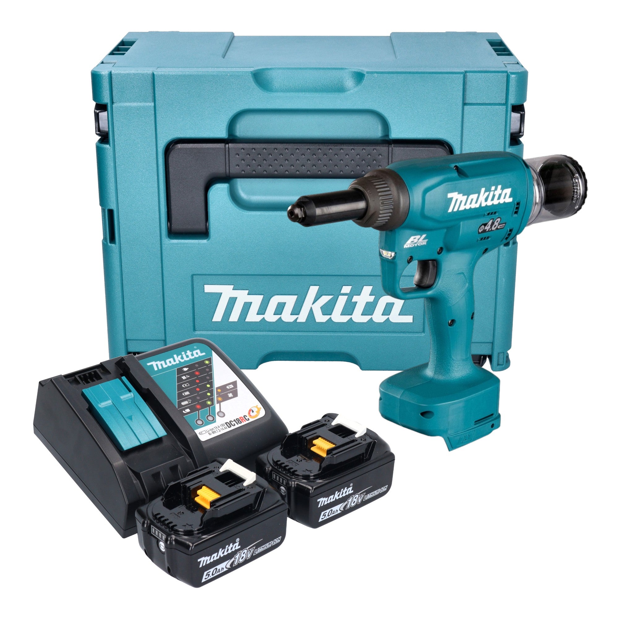 Makita DRV 150 RTJ Akku Blindnietsetzgerät 18 V 10 kN 2,4 - 4,8 mm Brushless + 2x Akku 5,0 Ah + Ladegerät + Makpac