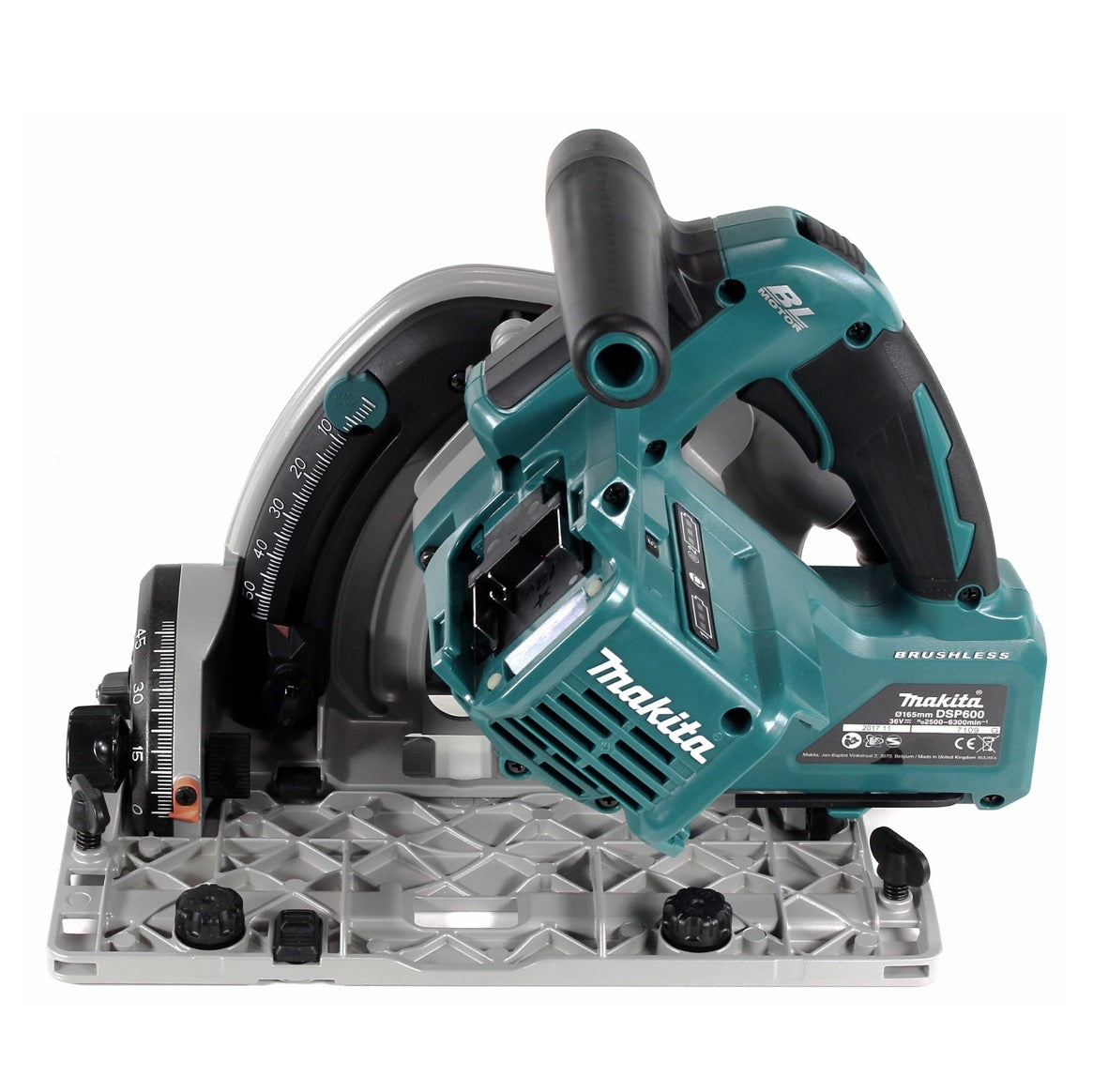 Das Elektrowerkzeug ist speziell zur Durchführung von Tauchschnitten vorgesehen. Das Werkzeug ist auch für Längs- und Querschnitte in Holz vorgesehen. Wenn das Werkzeug mit einem regulären Kreissägeblatt bestückt wird, kann es zum Sägen von Aluminium, Kunststoff, Mineralkunststoff und ähnlichen Materialien verwendet werden. Die Akku-Tauchsäge überzeugt durch den bürstenlosen Motor, welcher für erhöhte Ausdauer, längere Lebensdauer, kompaktere Bauweise und erhöhte Leistungsfähigkeit steht. Die Tauchkreissäge hat eine regelbare Drehzahl, eine Konstantelektronik, Sanftanlauf und eine Überlastschutz, welcher den Motor schützt. Die Kreissäge hat während des Betriebes eine Automatic torque Drive Technology wodurch die Drehzahl automatisch reguliert wird, um je nach Anforderung eine optimale Leistung zu erzielen. Die Tauchsäge besitzt eine Winkelschnelleinstellung für -1°, 22,5° und eine Schnellvorwahl von 45° oder 48° als maximalen Kippwinkel. Der Schnittpunkt bleibt bei allen Winkeleinstellungen an exakt der gleichen Stelle. Der Anreiß-Modus sorgt für einen ausrißfreien Schnitt. Auch bei höchstem Neigungswinkel kippt das Gerät nicht von der Führungsschiene. Die Säge ist kompatibel mit den Makita Führungsschienen. Die ausdauernden 5,0 Ah Akkus überzeugen durch ihre lange Laufleistung. Das Doppelladegerät lädt die zwei 5,0 Ah Akkus gleichzeitig in ca. 45 Minuten vollständig auf.