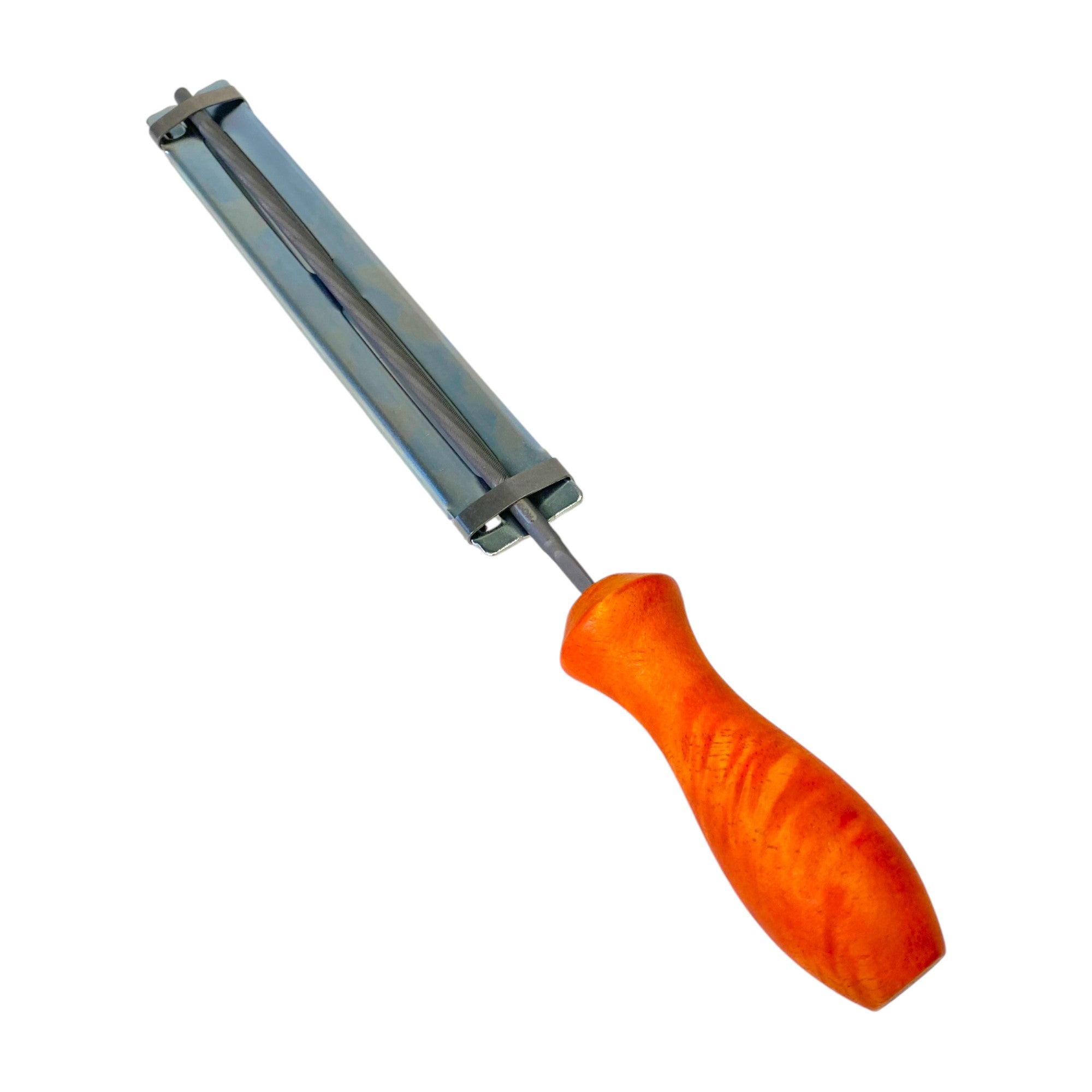 Der montierte Feilenhalter mit einer Rundfeile von 7/32" (5,5 mm) wird inklusive Holzgriff und Metallrahmenhalter geliefert und eignet sich ideal zum präzisen Schärfen von Sägeketten. Die Markierungen auf dem Rahmen erleichtern die korrekte und gleichmäßige Ausrichtung der Feile, sodass stets ein exakter Schleifwinkel eingehalten wird. Zudem hält der Halter die Feile in der optimalen Tiefe für effizientes und gleichmäßiges Schärfen. Dank seines ergonomischen Designs liegt er gut in der Hand und ist besonders komfortabel und einfach zu bedienen.