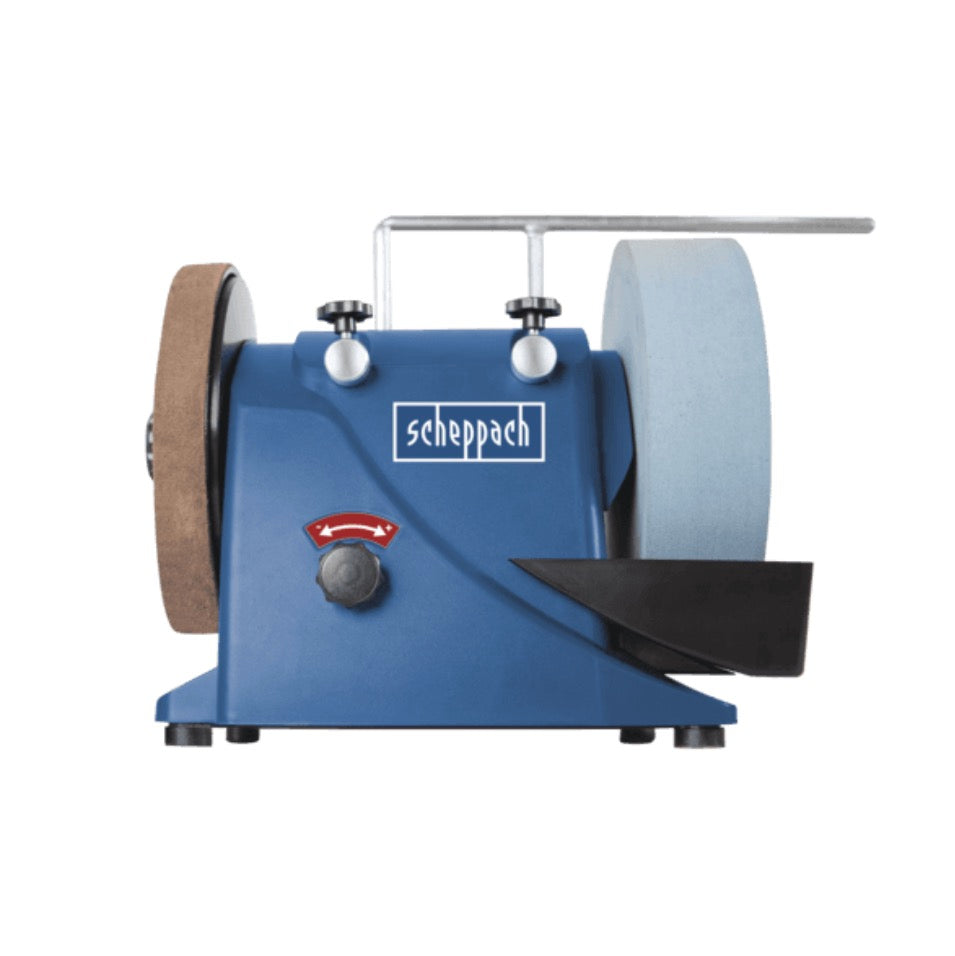 Das Scheppach Tiger 300 VS Nassschleifsystem ist der ideale Begleiter für jeden Handwerker. Dank der verbauten Vario Speed Funktion kann die Geschwindigkeit je nach Bedarf eingestellt werden. Somit werden exzellente Ergebnisse gewährleistet und der Anwender hat viel Freude am Gerät. Der Motor wurde dank Induktionstechnologie so konzipiert, dass er weniger Vibrationen abgibt. Dank der Wasserkühlung ist eine lange Lebensdauer und ein gutes Schleifergebniss gegeben. Eine große Schleifsteinauflagefläche von 63 mm und ein Durchmesser von 250 mm bieten eine lange Lebensdauer und ein großes Spektrum an zu schleifenden Materialien. Ein spezieller Edelkorund-Schleifstein mit Aluminiumoxyd liefert perfekte Schleifergebnisse auch bei hartem Stahl über 60 HRC. Der richtige Schleifwinkel kann dank der Winkellehre nicht verfehlt werden. Des Weiteren ist der verbaute Wassertank bruchsicher. Scheppach ist bekannt für gute Konzepte und ausgereifte Technik.