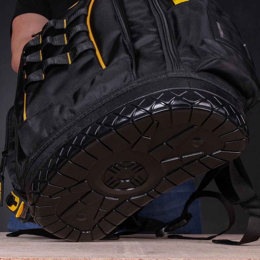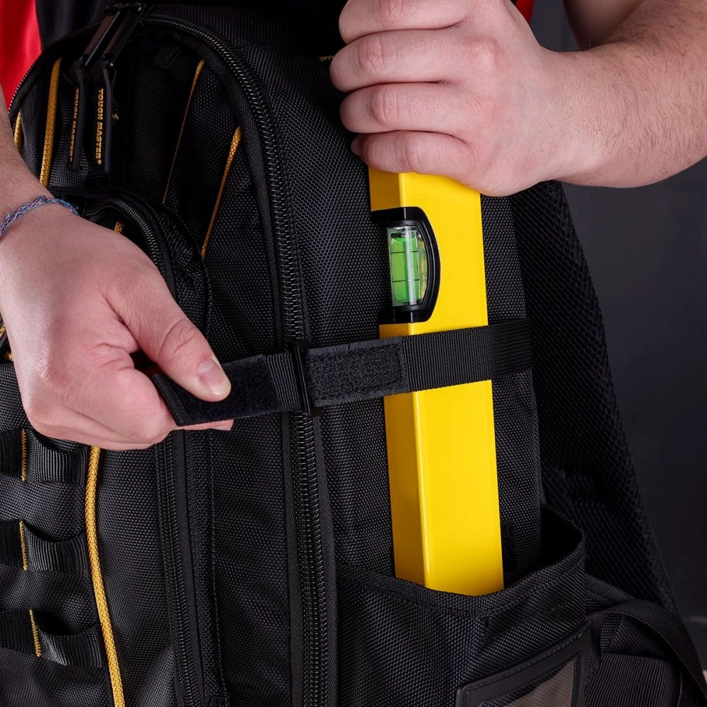 Mit diesem strapazierfähigen 18 Zoll Werkzeugrucksack der Marke TOUGH MASTER haben Sie Ihr Werkzeug immer griffbereit. Der Rucksack verfügt über einen herausnehmbaren Werkzeug-Organizer mit 9 Fächern und 6  Schlaufen, mit welchem Sie Ihre persönlichen Gegenstände von Ihren Werkzeugen trennen können. Des Weiteren beeindruckt die Werkzeugtasche mit seiner wasserabweisenden & robusten, mehrlagigen 1680D-Polyester-Beschichtung, die sich von der herkömmlichen 600D-Beschichtung deutlich abhebt, sowie mit den sorgfältig gestalteten Doppelnähten und dem gummierten Griff. Zum Schutz Ihrer Wertsachen vor Beschädigung verfügt dieser professionelle Werkzeugrucksack über einen robusten Gummiboden und eine Schaumstoffschicht für zusätzliche Polsterung. Der Gummiboden soll den Rucksackinhalt vor feuchten und schmutzigen Oberflächen schützen und hält den Rucksack aufrecht, damit alles fest in den Taschen bleibt. Darüber hinaus besitzt der Werkzeugaufbewahrungsrucksack insgesamt 12 Fächer, darunter ein gepolstertes Laptop-Fach, in dem ein Laptop mit bis zu 17" (Zoll) Bildschirmdiagonale verstaut werden kann. An der Außenseite befindet sich ein verstärkter Nylonhaken und ein genieteter Bandhalter, welche Ihnen leichten Zugang zu Ihrem Maßband und Ihren Kabelrollen gewährt. Wichtig für einen schmerzfreien Arbeitstag sind der gepolsterte Rücken und die gepolsterten Schultergurte. Diese sind mit einem weichen, atmungsaktives Netz versehen, welche Ihre Schultern schonen und rote Schultern vermeiden. Zu den weiteren Merkmalen der Werkzeugtasche gehören Riemen zum Aufhängen von Gegenständen, doppelte Gummireißverschlüsse, verstellbare Schultergurte und 2 Außentaschen, darunter eine tiefe Seitentasche für Ihre Wasserflasche oder Ihren Regenschirm.