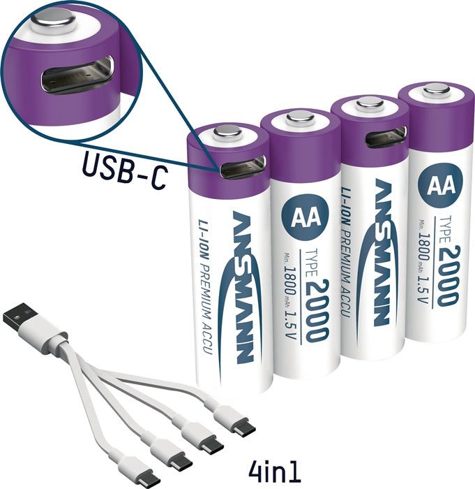 - 4x Mignon AA Li-Iom Akku 2000 mAh, 4 in 1 USB-C Ladekabel