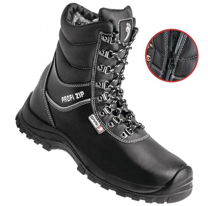 nach DIN EN ISO 20345 · S3 CI SRC · Obermaterial: glattes Rindleder · weiche Schaftpolsterung · komplett warm gefüttert mit Weblammfutter · zum Schnüren mit zusätzlichem seitlichen YKK-Reißverschluss für schnellen Ein- und Ausstieg · breite Stahlkappe · Stahlzwischensohle · ganze auswechselbare Fußbetteinlage, bezogen mit Weblammfutter · kälteisolierende, rutschhemmende PU/PU-Sohle mit Anstoßschutz, kälteflexibel bis -20 °C, nicht kreidend · zertifiziert nach DGUV 112-191 für den Einsatz bestimmter orthopädischer Einlagen · Weite 11 auf Anfrage auch ab Gr. 38 und bis Gr. 48 lieferbar