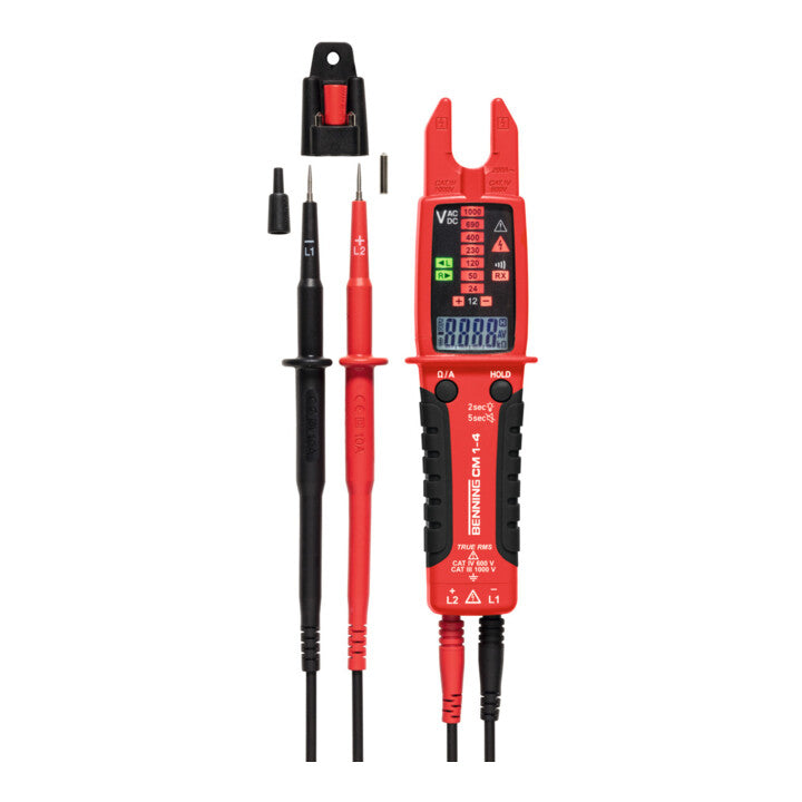 Lieferung inkl. Gürtel-Holster, Messleitungen, gummierter Kontaktspitzenschutz, Aufsteckkappen (CAT III/IV), Kontaktspitzenvergrößerung (Ø 4 mm), Batterien (2 x Typ AAA), Ersatzbatterien siehe Art.-Nr. 4000 901 810