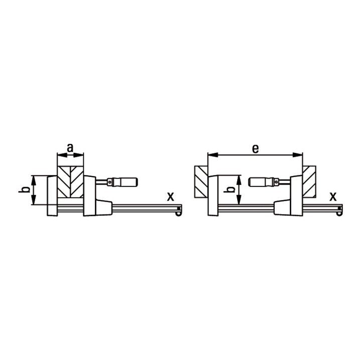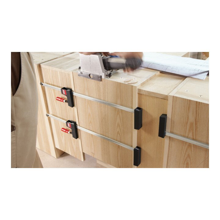 zum Spannen und Spreizen · Hohlprofilschiene aus gezogenem Qualitätsstahl · 2-fach geriffelt · galvanisch verzinkt · Gleit- und Festbügel aus Zinkdruckguss, galvanisch verzinkt · leichtgängige brünierte Spindel mit Trapezgewinde · Kunststoffschalen aus glasfaserverstärktem, leimabweisendem Polyamid (bruchfest) mit großen, planen Spannflächen für schonendes, paralleles Spannen ohne Zulagen · Spannkraft bis zu 1500 N · Besondere Produktvorteile: · Die Zwinge spannt rund um die Schiene, dadurch werden Spannstellen zugänglich, die mit üblichen Schraubzwingen nicht erreicht werden können. · Die Endsicherung ist zum Wenden des Unterteils werkzeuglos abnehmbar (problemlose Umrüstung auf Spreizfunktion).