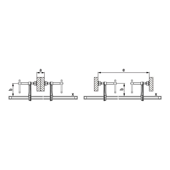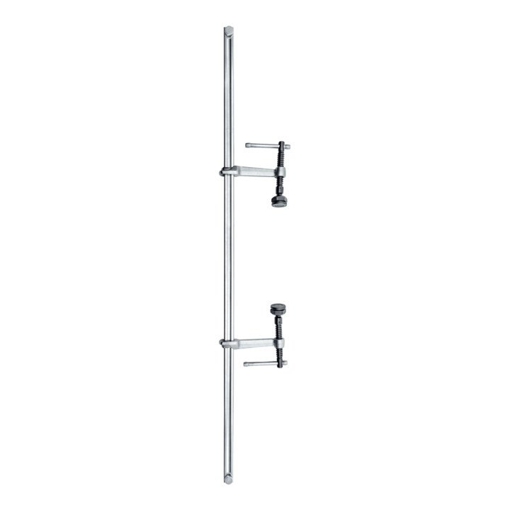 variable Hochleistungsschraubzwinge mit Schiene aus kalt gezogenem und verzinktem Profil · 2 Gleitbügel aus Vergütungsstahl geschmiedet · werkzeuglos zum Spreizen umsteckbar · die Zwinge kann durch Öffnungen im Werkstück geschoben werden · Spannkraft bis zu 6500 N (bei Spannweite bis 2000 mm) bzw. 9000 N (bei Spannweite 3000 mm) · hitzebeständige 35° schwenkbare Spezialdruckplatte (bei Spannweite bis 2000 mm) · mit Sinterstahleinlage bei Spannweite 3000 mm