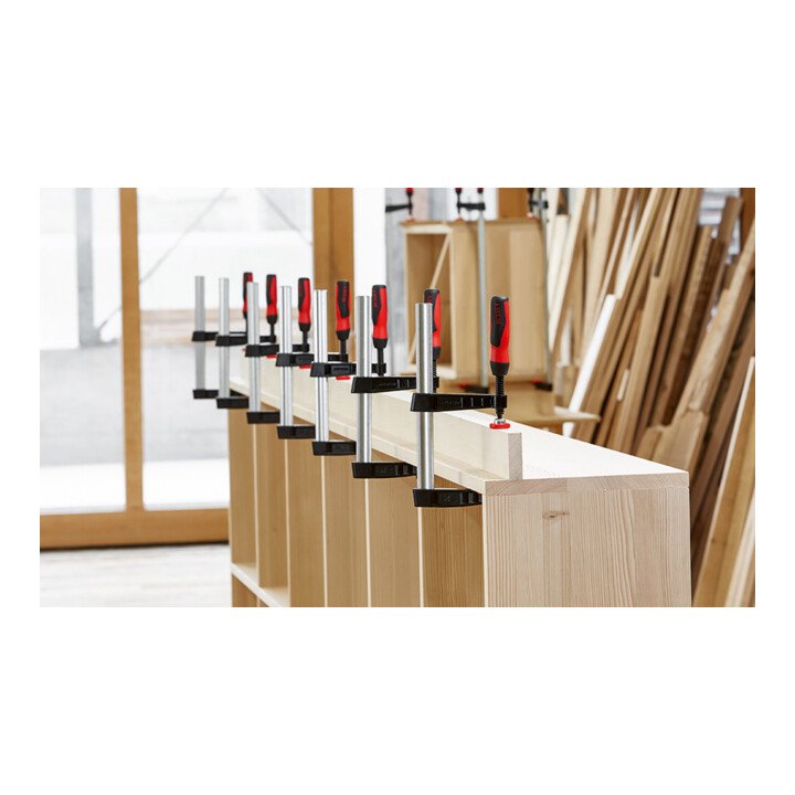 Spannkraft bis zu 6.000 N · hochwertiger 2-Komponenten-Kunststoffgriff · werkzeuglos wechselbare Druckplatten (ab 80 mm Ausladung) · mit Schutzkappen auf den Spannflächen · stabile Hohlprofilschiene mit Riffelung · BESSEY Rutschsicherung (ab 80 mm Ausladung)