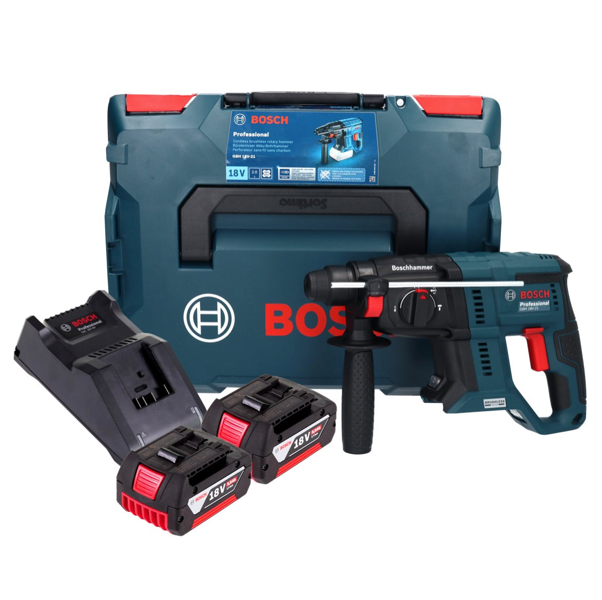 Bosch GBH 18V-21 Professional Akku Bohrhammer 18 V 2,0 J Brushless + 2x Akku 5,0 Ah + Ladegerät + L-BOXX