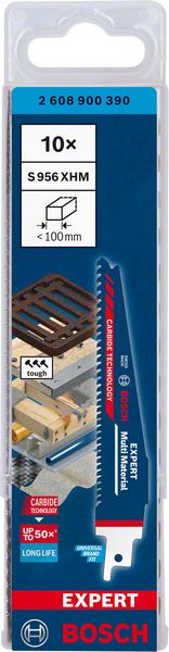 Bosch Carbide-Technologie für langlebiges Schneiden von zähen Baustoffen · schneidet Metall, Holz, Kunststoffe, Verbundwerkstoffe und vorgefertigte Elemente, die auf Baustellen eingesetzt werden · progressive Zahnteilung um dünne und dicke Materialien gleichermaßen zu schneiden · passend für alle S-Schaft-Säbelsägen