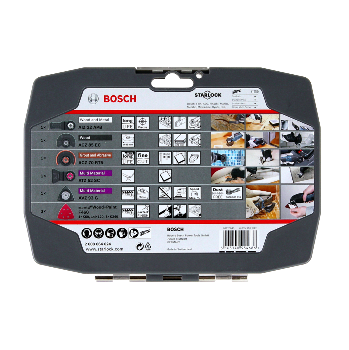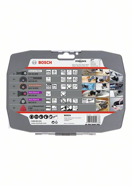Dieses Starlock Set beinhaltet das passende Zubehör für zahlreiche Renovierungsarbeiten. Das scharfe Blatt des Schaber ATZ 52 SC eignet sich ideal zum Entfernen von festem, spröden Material. Das besonders dünne Blatt von 1,6 mm Stärke des Segmentsägeblatt ACZ 70 RT5 erzeugt präzise Feinschnitte zum Entfernen von Mörtel und abrasivem Material. Das Segmentsägeblatt Starlock ACZ 85 EC ermöglicht zuverlässig Schnitte in Holz, bündige Schnitte in Massiv- und Weichholz sowie das Sägen von Kunststoff. Das vielseitig einsetzbare Tauchsägeblatt AIZ 32 APB schneidet auch sehr harte Verbundwerkstoffe aus Holz und Metall, wie auch ungehärtete Nägel und Schrauben, Rohre aus Nichteisenmetall und Profile kleinerer Abmessungen. Die Schleifplatte Starlock AVZ 93 G ermöglicht komfortables und rückschlagfreies Schleifen in Ecken. Mit Hilfe des Klettverschluss können u.a. verschiedene Schleifblätter zum Abschleifen, Aufarbeiten und Polieren von Holz, Farbe und Lack eingesetzt werden. Die drei passenden Schleifblätter mit verschiedenen Körnungen sorgen für ein einzigartiges Finish beim Aufrauen und Schleifen von Holz und Lackflächen. Das 5tlg. Zubehörset ist kompatibel mit allen Elektrowerkzeugen des Typs Starlock, Starlock Plus und Starlock Max sowie allen gängigen Multifunktionswerkzeugen. Das Starlock-Aufnahmesystem ermöglicht ‌einen schnellen Blattwechsel ohne Blattberührung in drei Sekunden.‌ Das Starlock-Aufnahmesystem ermöglicht durch seine dreidimensionale enge Passung maximale Kraftübertragung zwischen Maschine und Zubehör. Die Auswahl des qualitativ hochwertigen Materials und dessen Verarbeitung sorgen für eine lange Lebensdauer des Sets. Für einen sicheren Transport ist das Werkzeug in einer praktischen Kunststoffbox aufbewahrt.