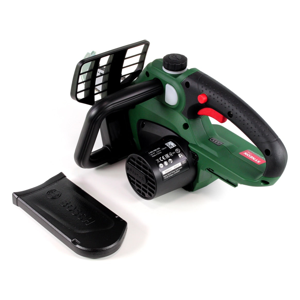 Diese Kettensäge von Bosch ist außergewöhnlich leicht. Sie wiegt ohne Akku lediglich 2,5 kg. Das optimierte Bosch SDS-System ermöglicht ein werkzeugloses Wechseln und Spannen der Kette. Ein stabilisierender Führungsschutz mit Stahlkrallen sogrt zudem für saubere Unterschnitte mit minimalen Astschäden. Man kann einfach zwischen anspruchsvollem Pflanzenschnitt, Abfallentsorgung und Sägen von Brennholz wechseln.