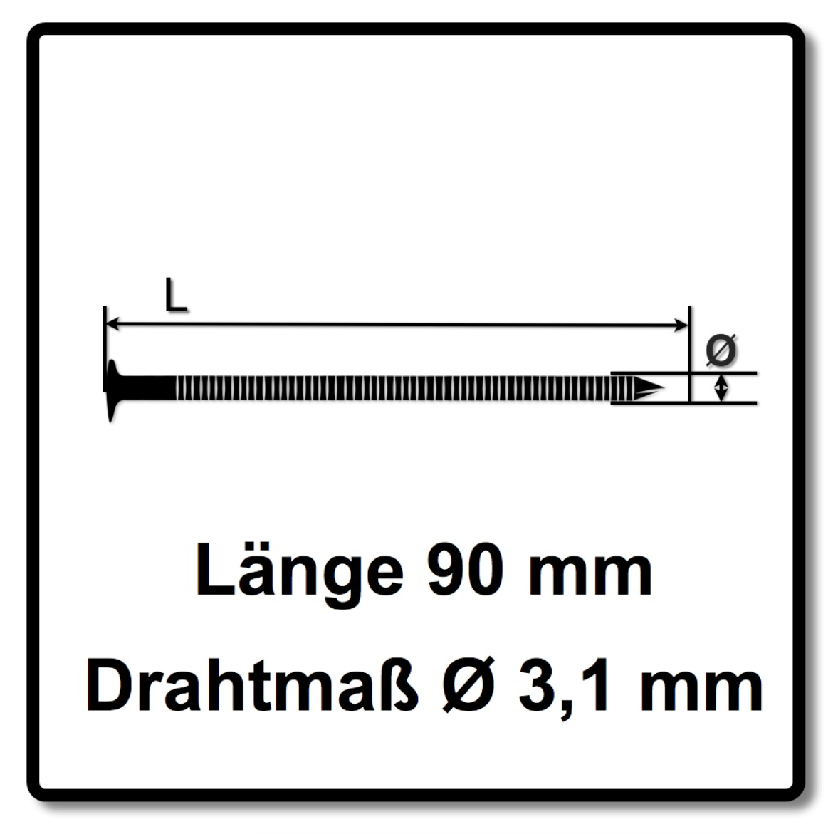 Die Bostitch Coilnägel mit Ringschaft verfügen über eine Länge von 90 mm, einem Drahtmaß von 3,1 mm, einem 7,2 mm breiten Kopf und eignen sich für Druckluftnagler verschiedenster Hersteller.