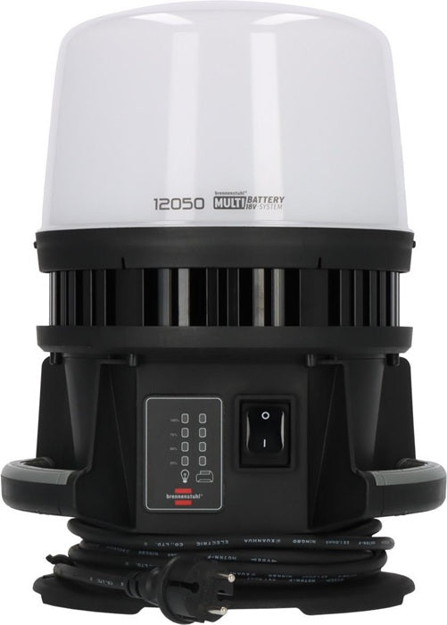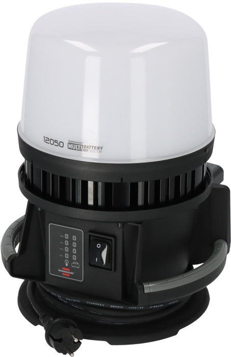 Produktbeschreibung:leuchtstarker Multi Battery LED 360° Hybrid Baustrahler · staub- und spritzwassergeschützt · kompatibel zu elf 18V Akku-Systemen der Powertool-Hersteller: Bosch Professional, Dewalt, Einhell, Fein, Festool, Flex, Hikoki, Makita, Metabo CAS, Milwaukee und Würth · Ein/Aus Schalter, über welchen man zudem die 4 Schaltstufen (100% - 75% - 50% - 25% Licht) steuert · Hybrid-Technik: Netz und Akku Betrieb möglich · mit fest installiertem 5 m Kabel (H07RN-F2X1,0) · Akku-Zustandsanzeige · Kabelaufwicklung · Haken zum Aufhängen · flexible Nutzung: stehend, hängend, auf Stativ montierbar · Leuchtdauer in Abhängigkeit des verwendeten Akkus: ca. 12 min/1Ah bei 100% Lichtleistung, ca. 16 min/1Ah bei 75% Lichtleistung, ca. 24 min/1Ah bei 50% Lichtleistung, ca. 48 min/1Ah bei 25% Lichtleistung · Farbtemperatur: 6500K · Schutzart: IP54 · Schlagfestigkeit: IK08