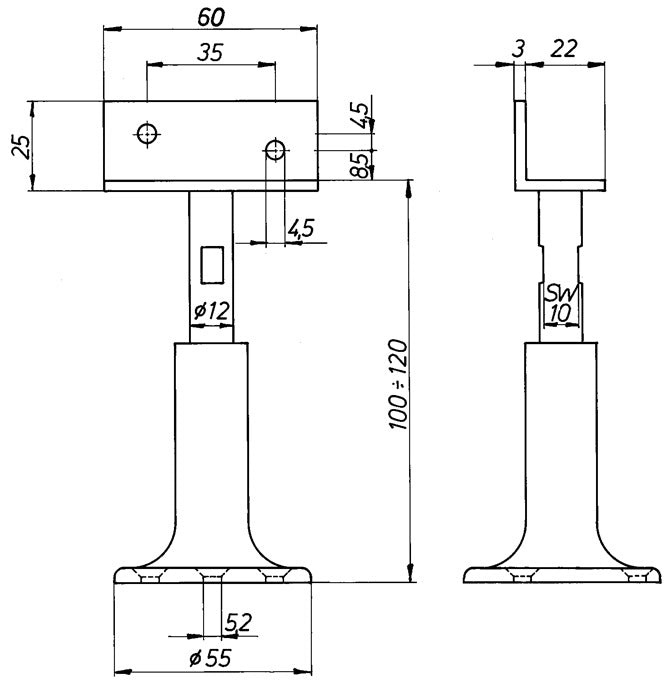 höhenverstellbar · Aluminium · mit Auflagewinkel · Bodenplatte mit Schraublöchern · durch Gewinde M12 verstellbar · für Höhen von 100 - 120 mm