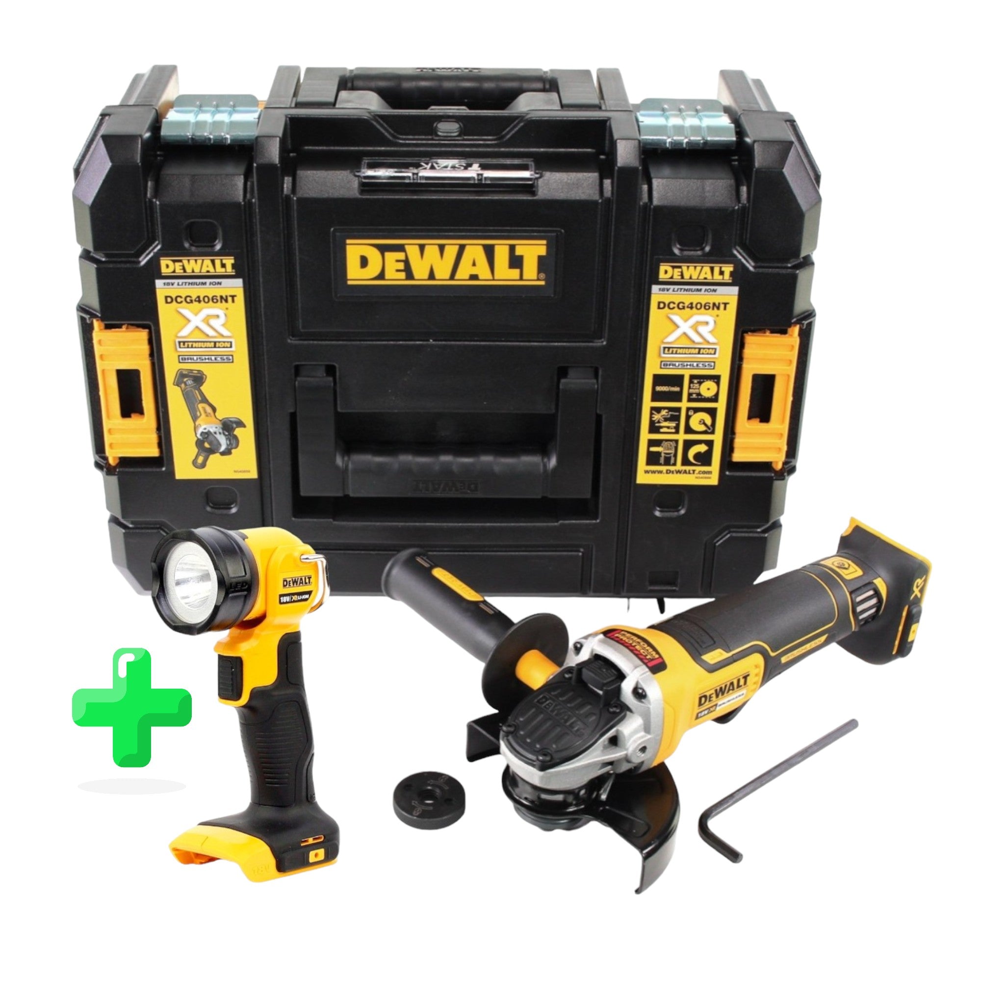 DeWalt DCG 406 NT Akku Winkelschleifer 18V 125mm Brushless Solo + TSTAK + DeWalt DCL 040 18V XR Li-Ion Akku Lampe
