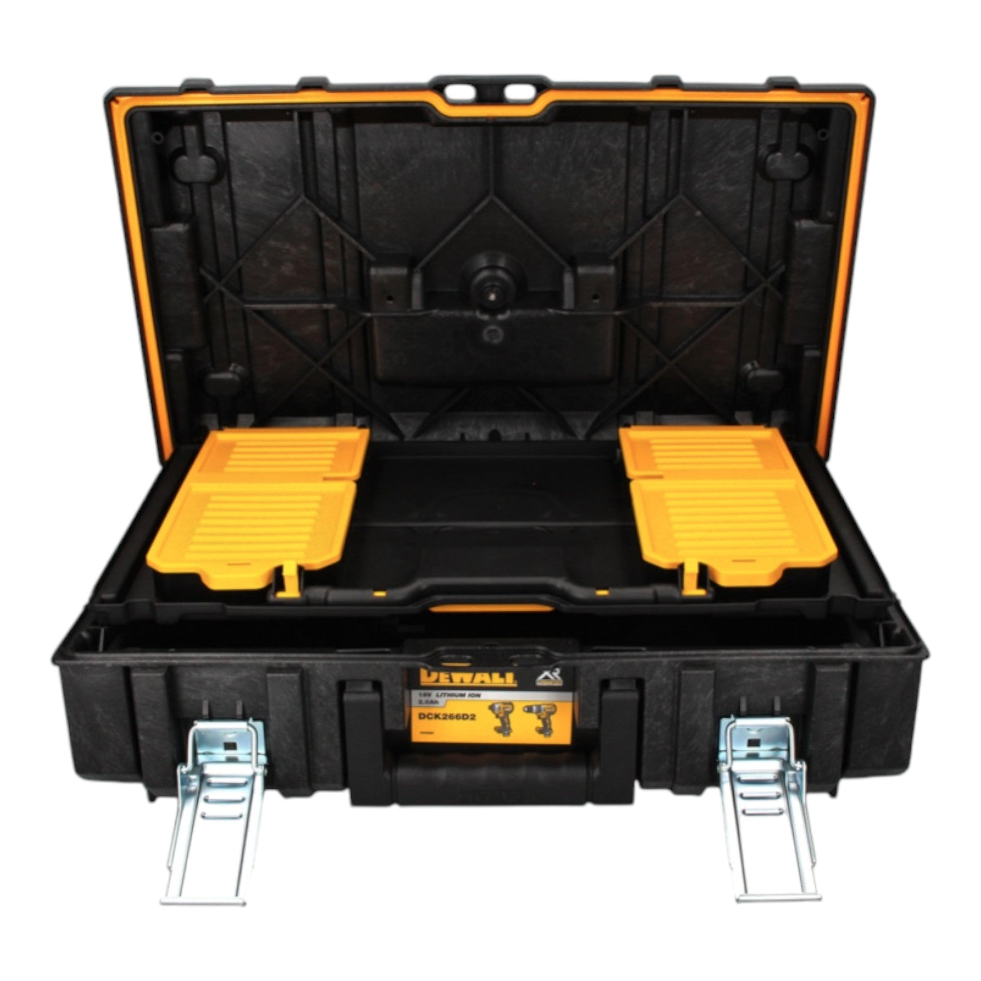 Das DCK 266 P2T Akku Kombopack besteht aus dem DCD 796 Akku Schlagbohrschrauber, DCF 887 Akku Schlagschauber, zwei Akkus mit jeweils 5,0 Ah Kapazität, einem Schnellladegerät und einen TSTAK Koffer.