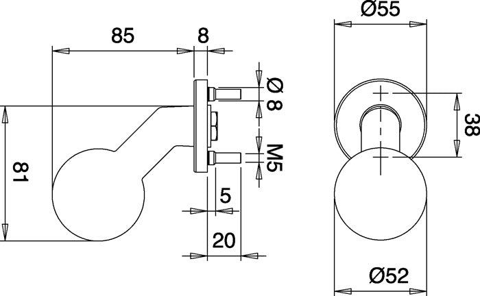 aus Edelstahl · auf runder Rosette · gekröpfter Kugelkopf · Rosetten-Ø 55 mm · Höhe 85 mm · Rosetten-Stärke 8 mm · Schraublochabstand 38 mm