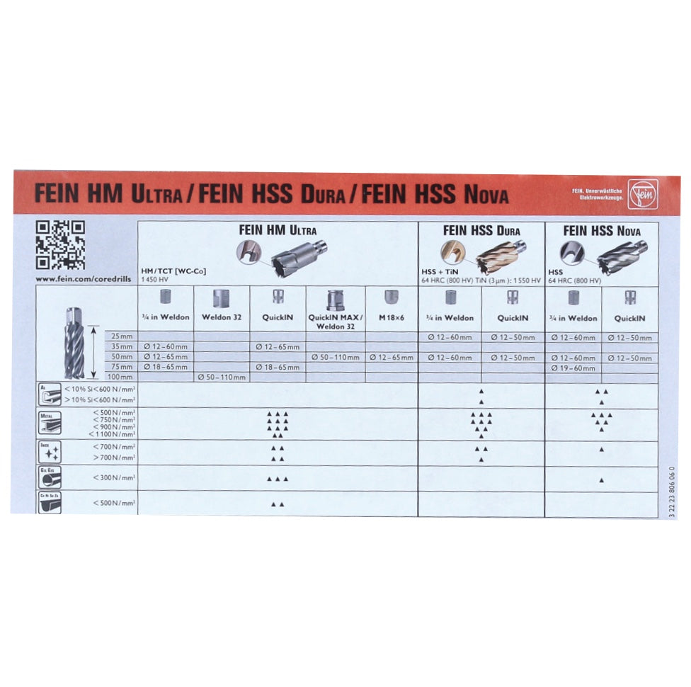 Das Best of Kernbohrer HSS Nova 50 Zubehörset von FEIN bietet eine breite Anzahl der gängigsten Kernbohrer. Bei einer maximalen Schnitttiefe von 50 mm ist eine hohe Standzeit von den Bohrern gegeben. Das Set besteht aus 6 Kernbohrern in den Größen  12, 14, 16, 18, 20 und 22 mm. Des weiteren sind zwei Zentrierstifte in einer Länge von 105 mm enthalten. Die Kernbohrer sind dank der 3/4" Weldon Aufnahme für die Kernbohrmaschinen KBE 30, KBE 50-2 ;, KBE 50-2, KBE 35 und für die KBB 40 geeignet.