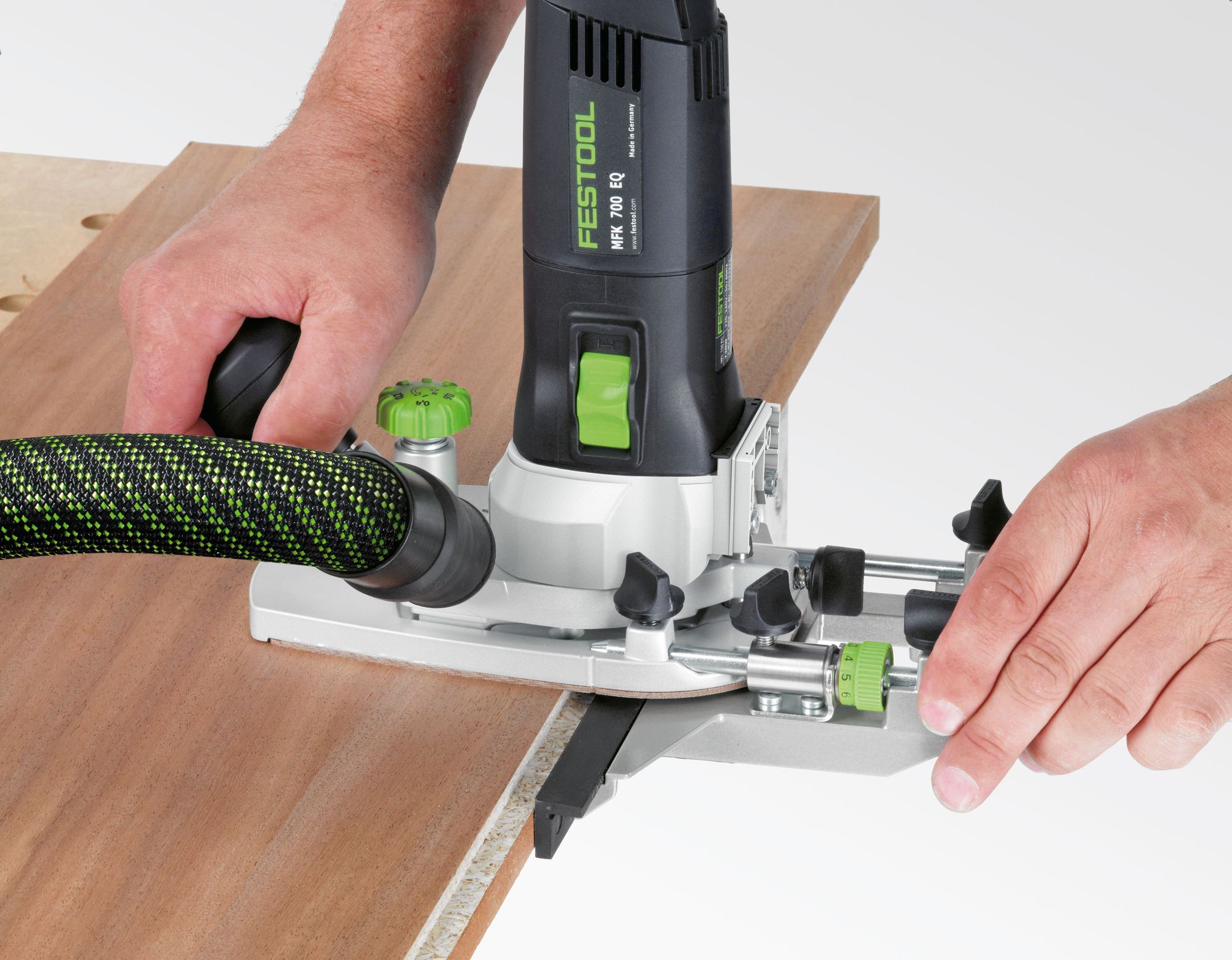 Seitenanschlag zum Fräsen parallel zur Werkstückkante. Langlebig und stabild dank Magnesium-Druckguss-Gehäuse.