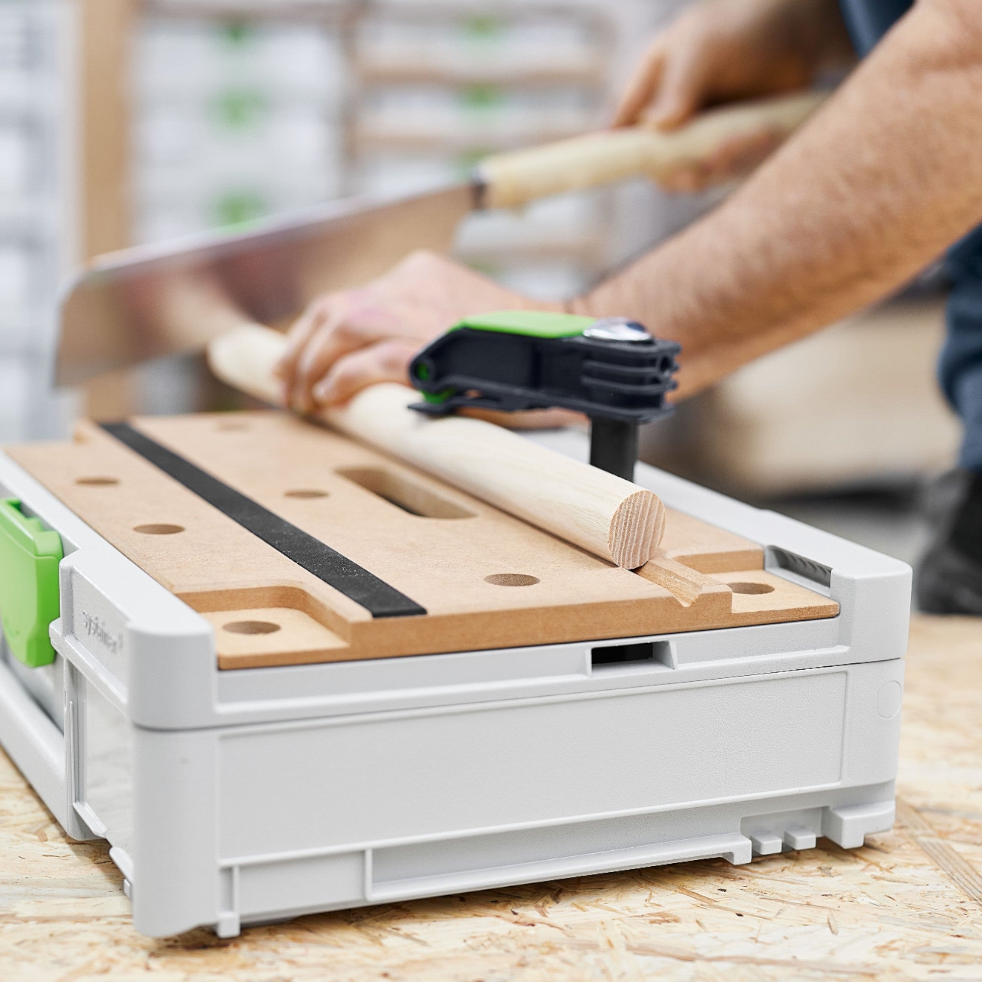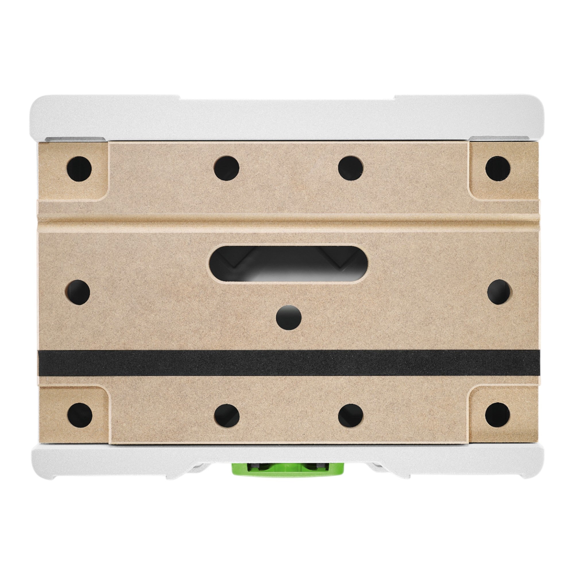 Der Festool SYS3-MFT M 112 ist weit mehr als nur ein Koffer – er ist eine vollwertige, mobile Werkbank im praktischen Systainer-Format. Als mobiler Arbeitsplatz eignet er sich perfekt für unterwegs und macht dich auf jeder Baustelle oder bei Montagen flexibel. Ganz gleich, ob es ums Sägen, Bohren oder Schleifen geht – die robuste MDF-Lochplatte im Deckel ermöglicht dir unkompliziertes Arbeiten. Schraubzwingen und Spanner lassen sich direkt darin fixieren, sodass du Werkstücke verschiedenster Formen sicher befestigen kannst, sogar runde Stäbe und Rohre bis zu einem Durchmesser von 50 mm. Für zusätzliche Stabilität sorgt die integrierte Haftunterlage aus Moosgummi, die ein Verrutschen beim Bearbeiten verhindert – selbst dann, wenn du auf das Spannen verzichtest. Nach getaner Arbeit verstaust du sämtliches Zubehör einfach im Inneren des Systainers, wodurch alles ordentlich und griffbereit bleibt. Der SYS3-MFT ist vielseitig einsetzbar und mit allen Zwingen und Spannern des Festool Multifunktionstisches MFT kompatibel. Dank der Einbindung in das gesamte Festool Systainer-System lässt er sich unkompliziert koppeln und transportieren. Darüber hinaus überzeugt er mit praktischen Details: Für die Bearbeitung langer Werkstücke kannst du einen zweiten Systainer der gleichen Höhe (SYS3 M 112 oder SYS 1 T-LOC) nutzen. Die Höhe des SYS3-MFT entspricht zudem exakt der Arbeitshöhe der Festool Sägetische KAPEX (KS 120 ohne Standfüße bzw. KS/KSC 60 mit Standfüßen), was ihn zur idealen Abstützung beim Sägen langer Werkstücke macht. Damit ist er ein zuverlässiger Begleiter für Profis, die Wert auf Mobilität, Ordnung und Effizienz legen.