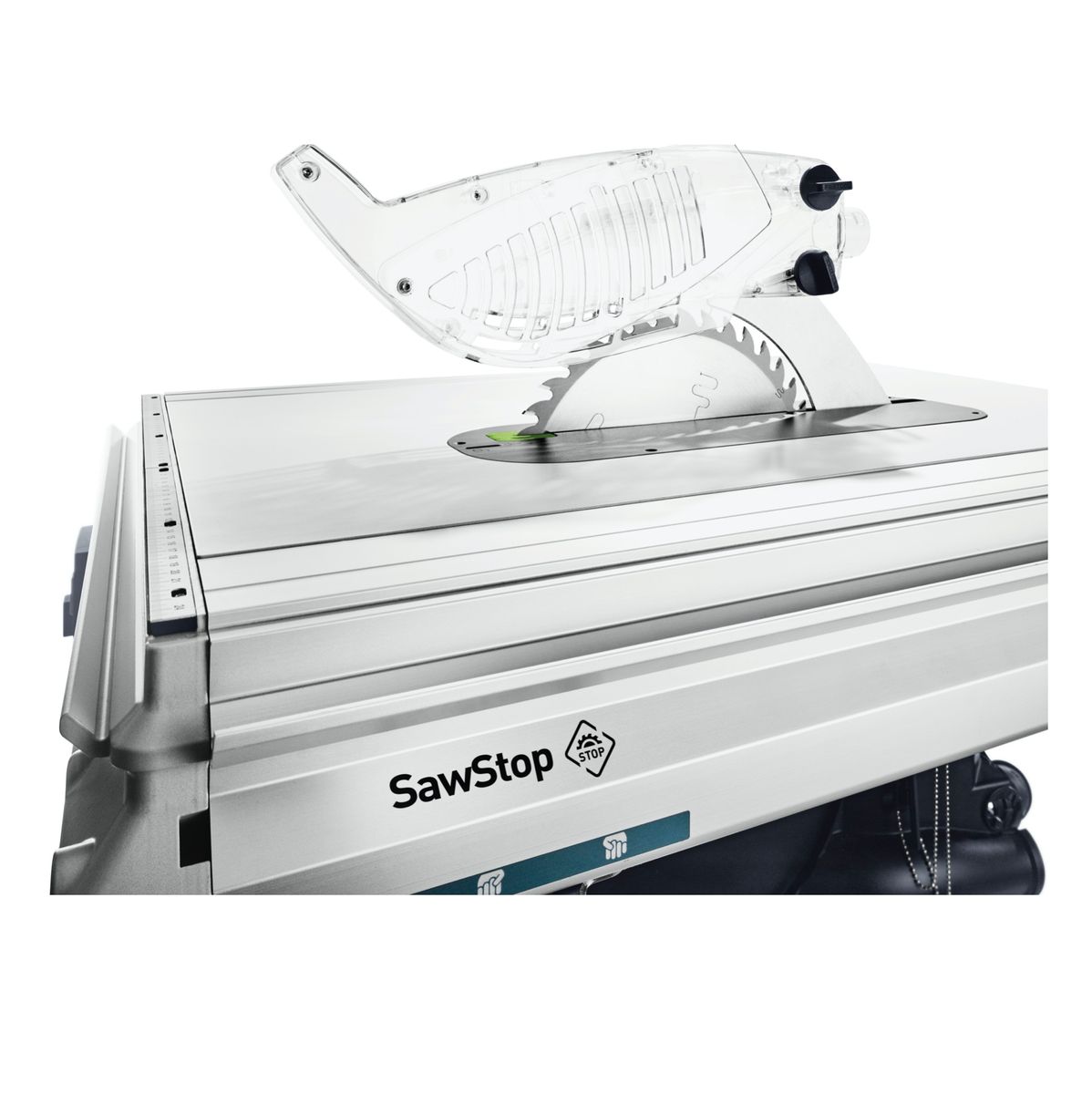 Die Festool Tischkreissäge TKS 80 EBS bringt ein Maximum an Sicherheit in die Werkstatt. Dank der sensiblen SawStop Technologie wird für mehr Sicherheit beim Sägen von nichtleitenden Metallen gesorgt. Beim Hautkontakt stoppt die Säge sofort und verschwindet in der Arbeitsfläche. Die Patrone löst eine vorgespannte Feder und schießt einen Alublock in das Sägeblatt. Selbstverständlich ist die SawStop Technologie auch abschaltbar, so können dann leitende Materialien gesägt werden. Nach dem Auslösen ist die Patrone mit wenigen Handgriffen wieder ausgetauscht. Jährlich gibt es ca. 4000 Verletzungen beim Benutzen einer Kreissäge. Dass entspricht 16 Verletzungen pro Arbeitstag. Ungefähr 26 % der schweren Unfälle beziehen danach eine Unfallrente. Diese Zahlen sollten jedem Anwender zu denken geben, und man sollte in sein höchstes Gut den Körper und die Unversehrtheit investieren. Die TKS 80 EBS ist sehr flexibel einsetzbar. Ob eine Schnitthöhe von 80 mm, die erweiterbare Arbeitslänge oder der Längs- und Winkelanschlag, all das sorgt für eine große Flexibilität beim Arbeiten. Die Winkelskala mit Rastpunkten und Feineinstellung ist perfekt für Kapp- und Längsschnitte geeignet. Dank dem links Schwenken des Sägeblatts ist ein geringerer Ausriss am Werkstück gegeben. Es sind Kappschnitte bis zu einer Breite von 820 mm mit Schiebetisch, bei 20 mm Schnitttiefe problemlos möglich ( Schiebetisch nicht im Lieferumfang ). Auch Längsschnitte bis zu einer Schnitthöhe von 80 mm und einer Breite von 600 mm mit Verbreiterung sind kein Thema ( Verbreiterung nicht im Lieferumfang ). Des Weiteren ist durch die CLEANTEC Absaugmuffe eine freie Sicht und staubarmes Arbeiten gewährleistet. Die seitlich angebrachte Werkzeuggarage bietet Platz für Sägeblätter, Patronen und den Schiebestock. Festool ist ein Premiumhersteller von Elektrowerkzeugen, die hohen Qualitätsstandards und die raffinierten Werkzeugkonzepte zeichnen die Firma aus.