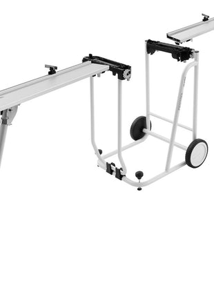 Das Set für mehr Moblität: Die beiden Kappanschläge für den rechten und linken Einsatz an der Kapex und dem Untergestell unterstützen die Arbeiten. Das Ablängen von Leisten und Balken wird durch die beiseitigen und stabilen Anschläge erleichtert. Die Kappanschläge sind einfach zu montieren: durch die V-Nut anbringen, feststellen, Standfüße ausklappen und justieren. Für den Transport können die Anschläge entfernt und die Säge eingeklappt werden. So einfach geht Transport.