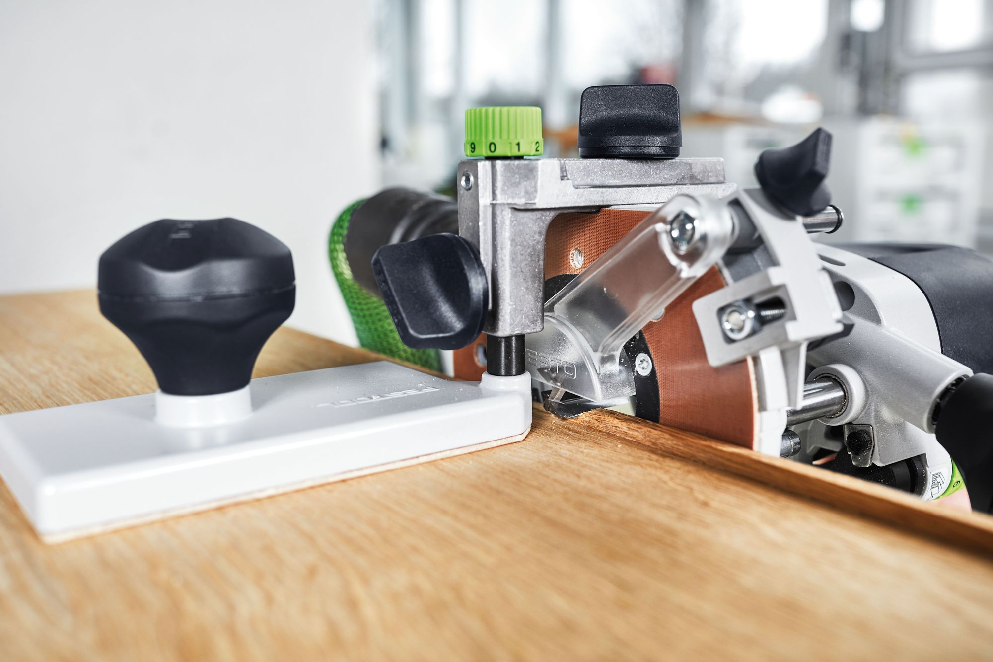 Durch die große Auflagefläche der Umleimerplatte ist ein sicheres Führen der Oberfräse möglich. In Verbindung mit dem Winkelarm WA-OF kann die Frästiefe exakt eingestellt werden. Speziel zum Bündigfräsen von Kanten geeignet.