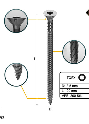 FORTE Tools Universal Holzschraube 3,5 x 20 mm T15 200 Stk. ( 000040113861 ) silber verzinkt Torx Senkkopf Vollgewinde