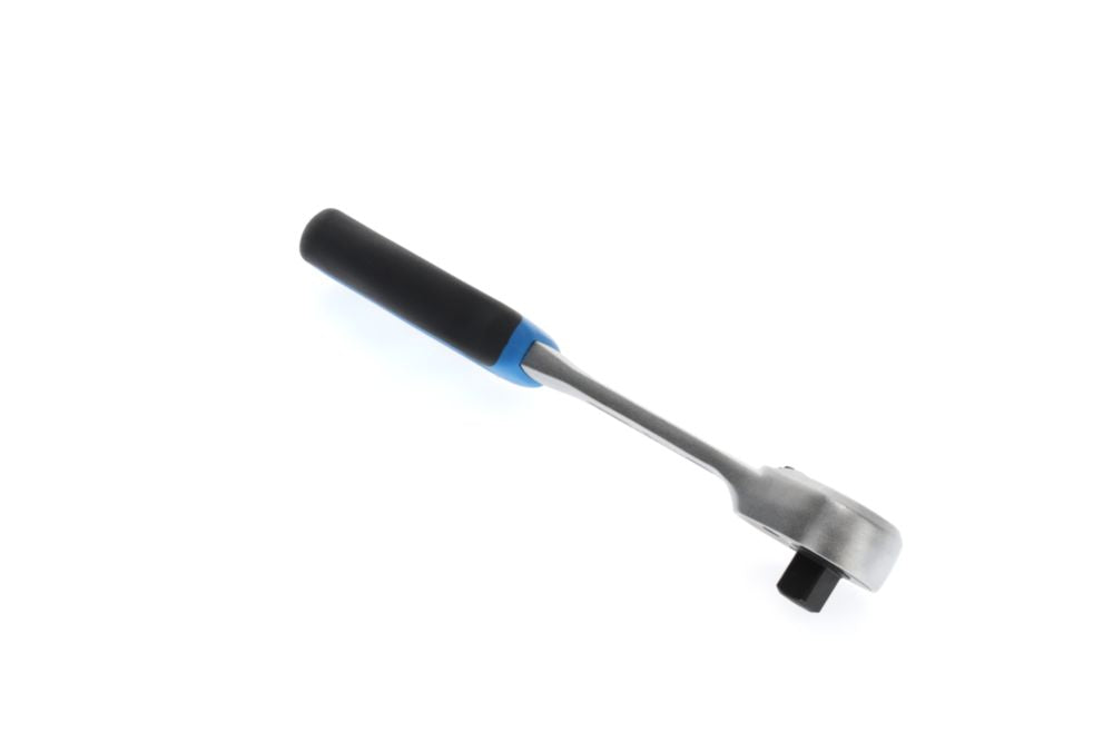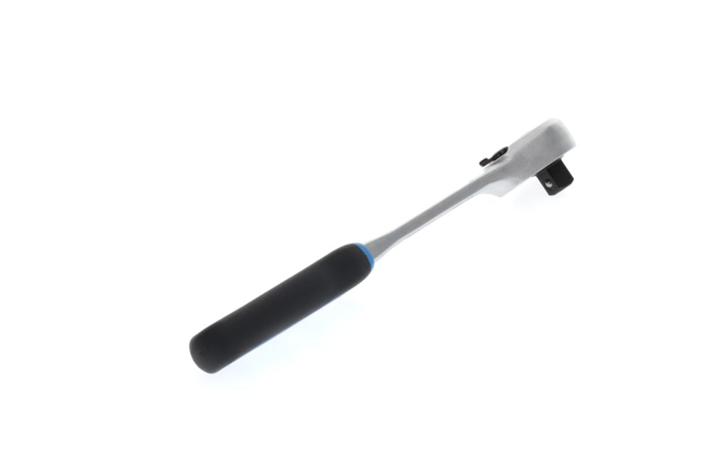 12,5 mm (1/2 ″)-Vierkantantrieb · mit 2 Komponentengriff mit Aufhängeloch · CV-Stahl · Nussverriegelungsfunktion mit Druckknopfauslösung und Einrastautomatik (beim Umschalten rastet der Schalthebel automatisch für Rechts- oder Linksgang ein) · Rückschwenkwinkel 6° 60 Zähne DIN 3122 / ISO 3315