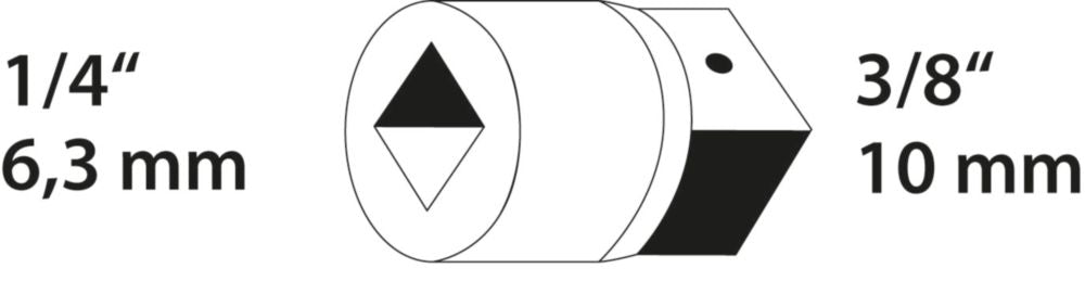 6,3 mm (1/4 ″)-Vierkantantrieb · für handbetätigte Steckschlüssel-Einsätze · mit Kugelarretierung · Vanadium-Stahl · verchromt · 6,3 mm (1/4 ″)-Innenvierkant auf 10 mm (3/8 ″)-Außenvierkant DIN 3123 / ISO 3316