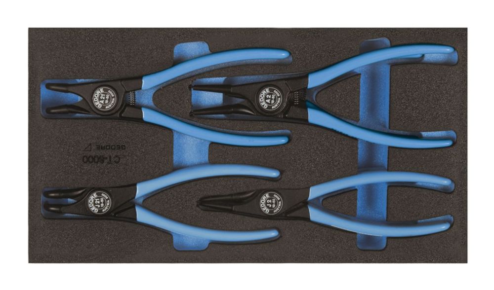 (1/3 Modul) mit Zangen für Sicherungsringe (Außen- und Innensicherungsringe) · mit geraden und gewinkelten Backen · aus Chrom-Vanadium-Sondervergütungsstahl Inhalt für Außensicherungsringe (schwarz, mit blau getauchtem Griffschutz, Klemmschutz): 1 Stück mit geraden Backen, Form A für Sicherungsringe 10 - 25 mm, Länge 141 mm 1 Stück mit geraden Backen, Form A für Sicherungsringe 19 - 60 mm, Länge 182 mm 1 Stück mit gewinkelten Backen, Form B für Sicherungsringe 19 - 60 mm, Länge 170 mm Inhalt für Innensicherungsringe (schwarz, mit blau getauchtem Griffschutz, Klemmschutz): 1 Stück mit geraden Backen, Form C für Sicherungsringe 12 - 25 mm, Länge 141 mm 1 Stück mit geraden Backen, Form A für Sicherungsring 19 - 60 mm, Länge 183 mm 1 Stück mit gewinkelten Backen, Form D für Sicherungsringe 19 - 60 mm, Länge 169 mm