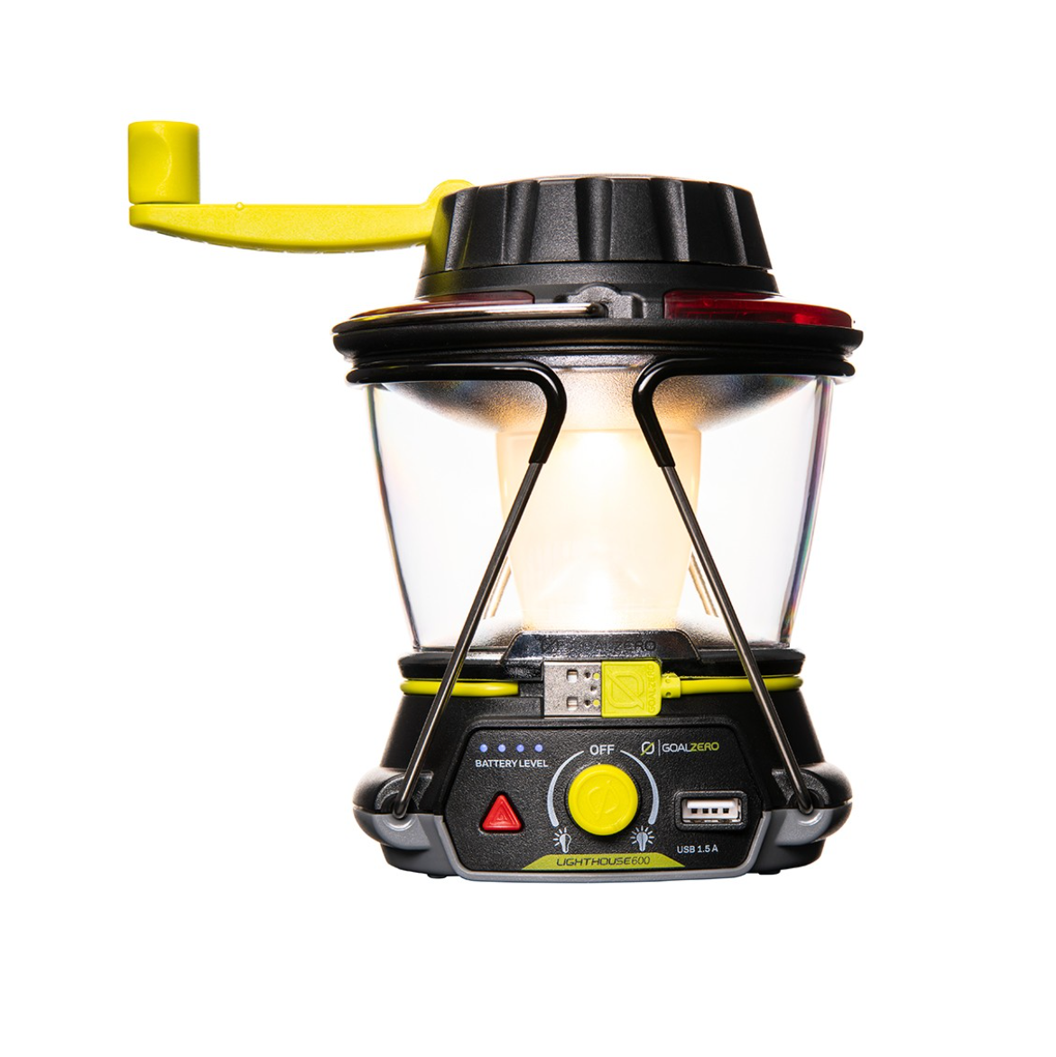 Mit der Goal Zero Lighthouse 600 LED Laterne bringen Sie Licht ins Dunkle. Dank der genialen 360 ° Beleuchtung, die auch auf 180° geschaltet werden kann sind die Anwendungen nahezu grenzenlos. Durch das Einstellrad der Lampe ist die Helligkeit nach belieben justierbar. Der integrierte USB Anschluss lässt ein Laden von Geräten wie zum Beispiel einem Smartphone zu. Die ausklappbaren Füße aus Stahl, sowie der Haken ermöglichen ein Hinstellen oder Aufhängen der Lampe. Des Weiteren besitzt die LED Laterne für Notfälle ein rotes Notlicht, somit ist für ausreichend Sichherheit beim Campen gesorgt. Ein weiteres geniales Fetaures ist, das man mit einer Handkurbel Strom erzeugen kann, somit ist für eine 1 Minute Handkurbeln 10 Minuten Licht vorhanden. Ob Campen, Wandern, auf der Terrasse, im Garten oder als Notlampe, die Lighthouse 600 von Goal Zero ist unverzichtbar in sämtlichen Lebenslagen.