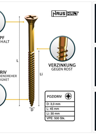 HausHalt Universal Holzbauschraube Holzschraube 3,0 x 45 mm PZ1 500 Stk. ( 000051371129 ) gelb verzinkt Kreuzschlitz Pozidriv Senkkopf Teilgewinde