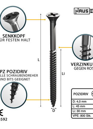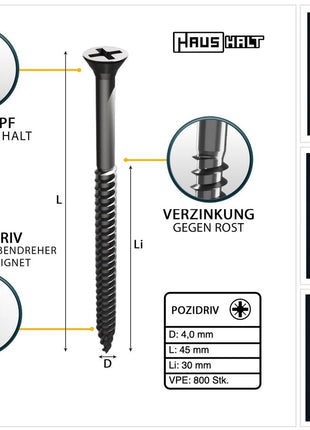 HausHalt Universal Holzbauschraube Holzschraube 4,0 x 45 mm PZ2 800 Stk. ( 2x 000051371117 ) silber verzinkt Kreuzschlitz Pozidriv Senkkopf Teilgewinde